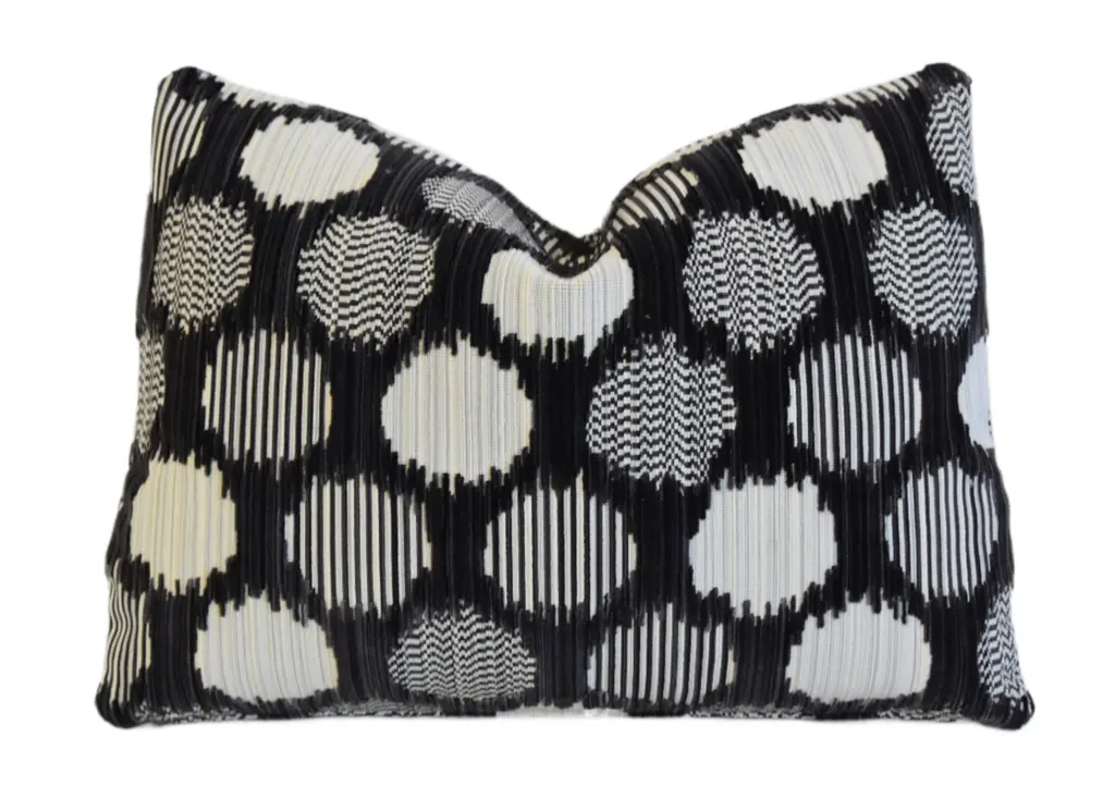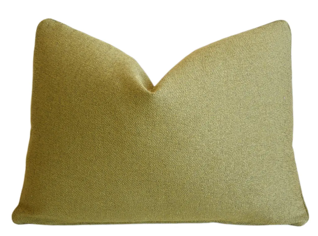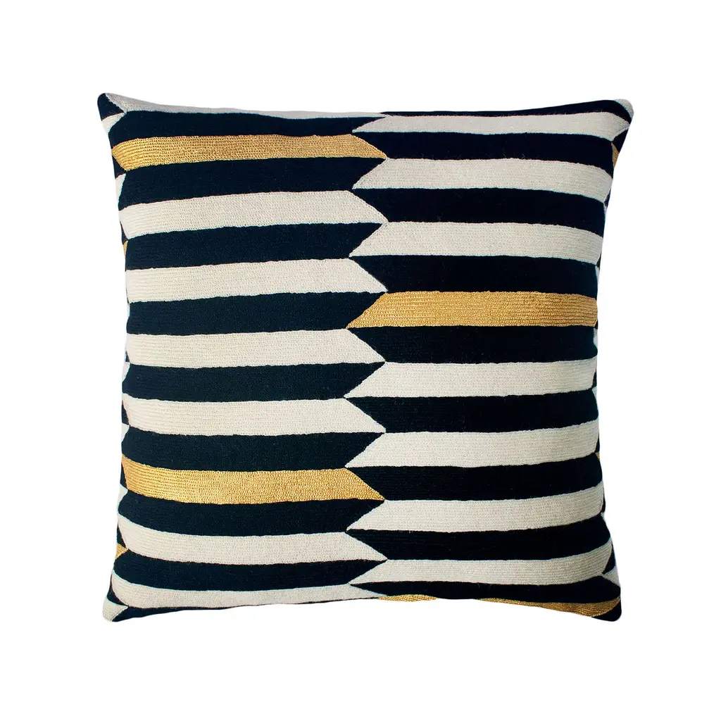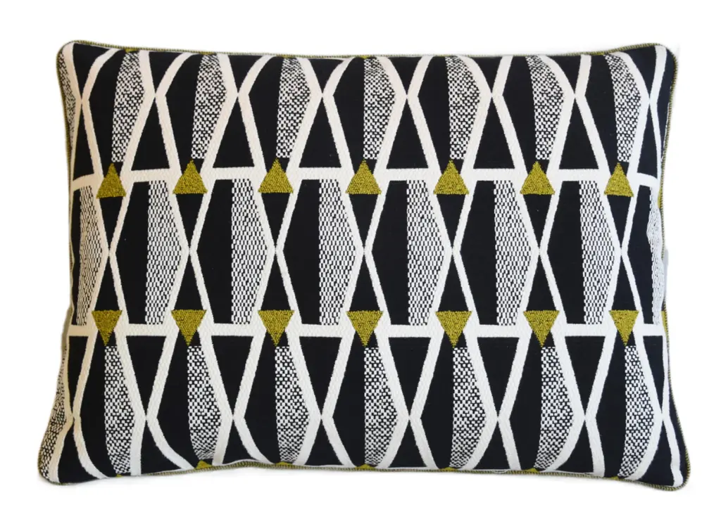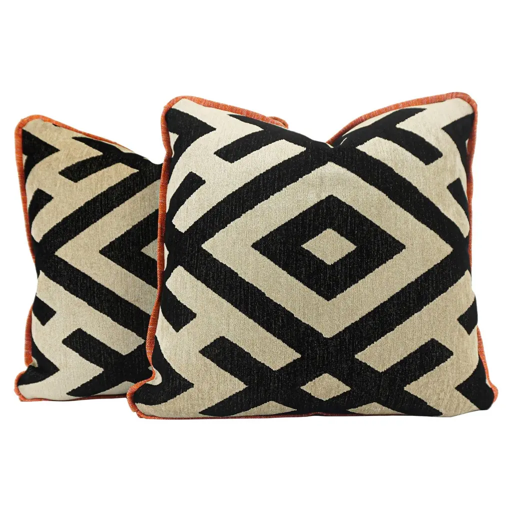 Custom-tailored pillow in designer Gaston Y Daniela "Hepburn Verde" geometric modern fabric. Green woven linen-cotton fabric back. Custom cord trim. Zipper closure. New plump goose down-and-feather insert. Excellent new, unused condition!!
