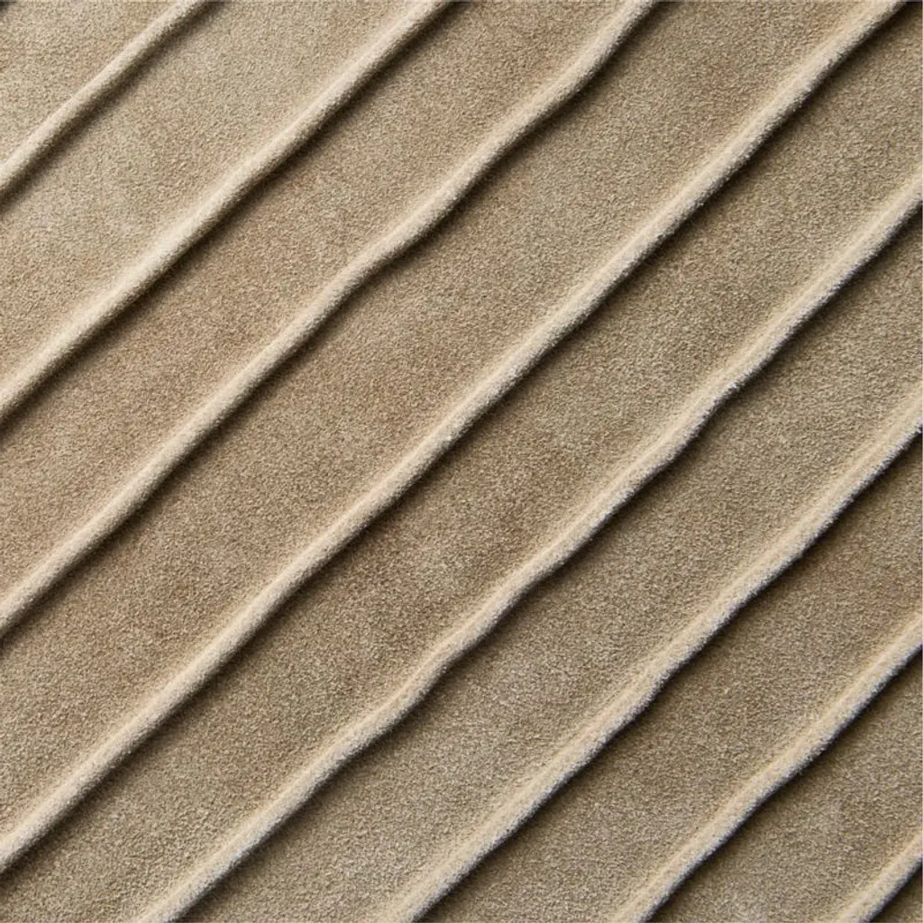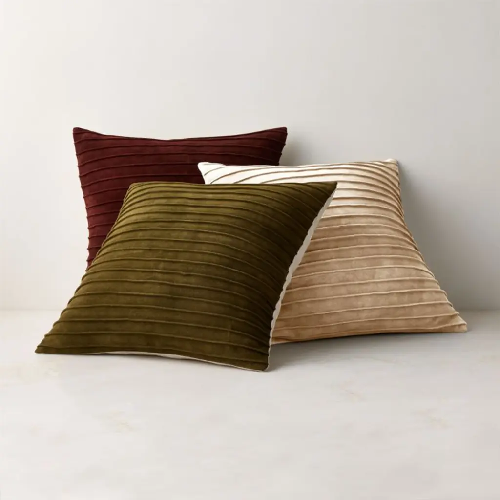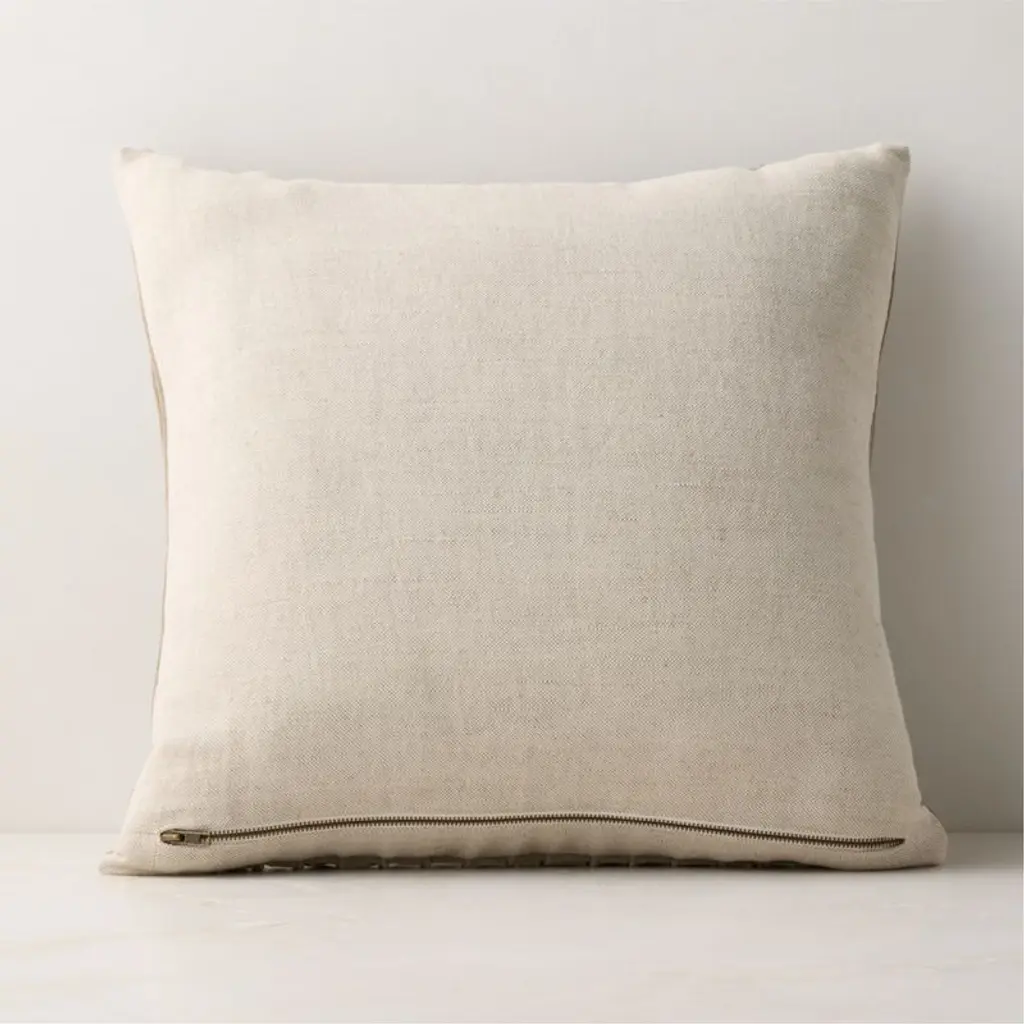 Buttery-soft taupe suede is cut into panels to create an elegant gathered effect that's perfect for layering texture on a sofa or bed. Throw pillow flips to a solid natural linen-cotton back with an exposed zipper. CB2 pillows include a pillow insert in your choice of feather down or down alternative. CB2 exclusive.