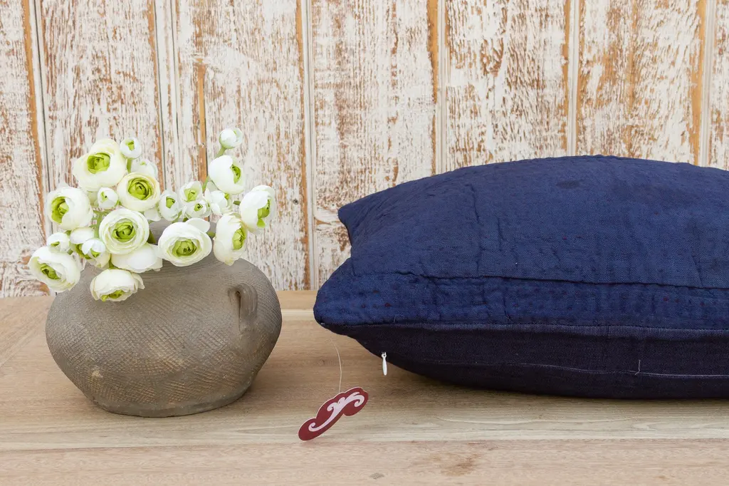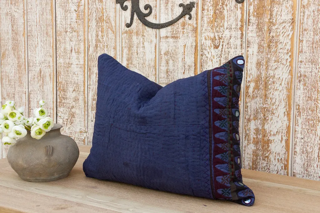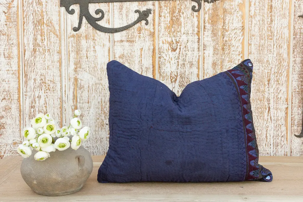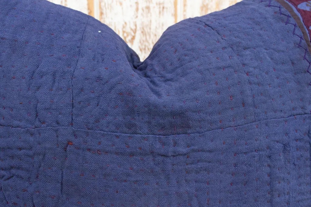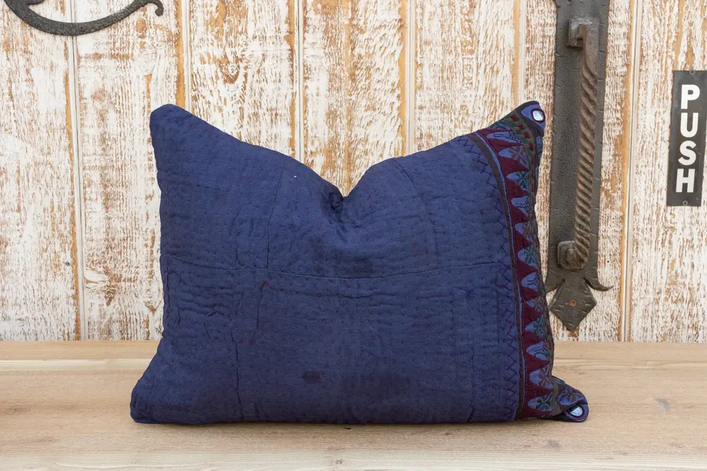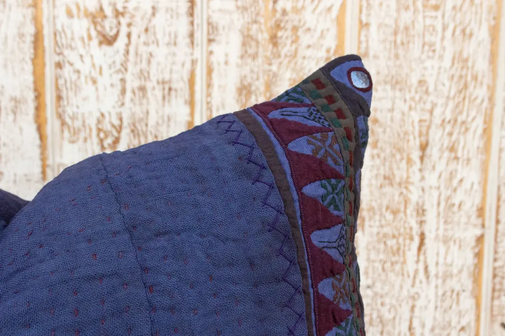 Beautiful antique Indigo pillow fashioned from an antique grain sack. This Indian throw pillow features intricate stitching of tribal motifs hand-stitched in vibrant colors. This pillow is from the Kutch style of embroidery which is characterized by chain, open chain stitching, a signature of the northern Indian tribes. This decorative pillow has a linen back, a zipper closure and a down blend filler insert is included.