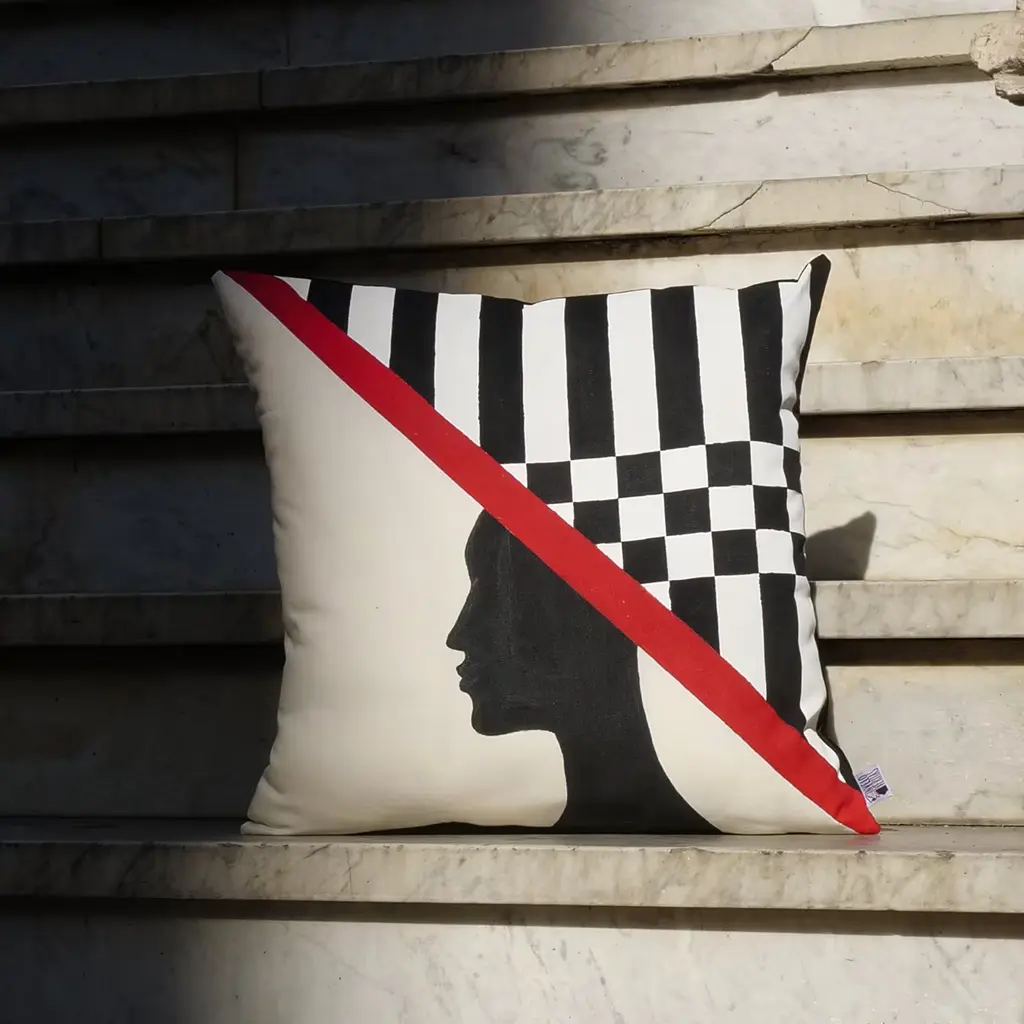 This stunning artisan cushion fashioned of a cotton blend boasts an intriguing mix of checkered and striped patterns in black and white coupled with the graceful, hand-painted profile of a female face, the contrast sealed by a red oblique stripe splitting the cover in two. The geometric design is inspired by the "Sa Bèrtula", a traditional fabric used to craft saddlebags for shepherds. Manual washing is recommended. Do not bleach or add softener.