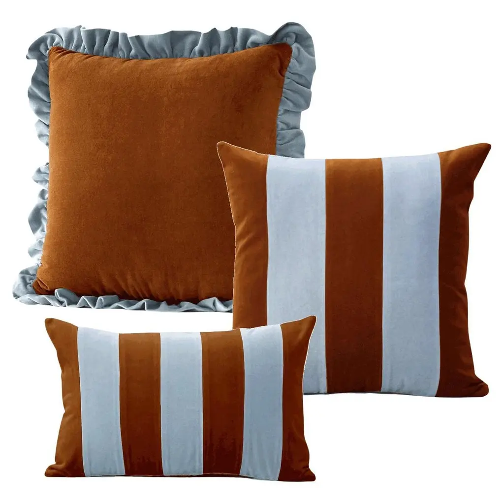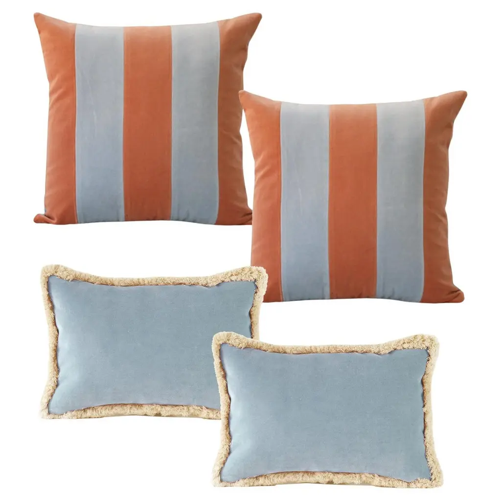 Transform your space with this set of 4 cushions, true talismans for your home that will bring beauty, good energies and comfort.Elevate your home’s ambiance with our handcrafted cushions, designed to bring beauty, positive energies, and comfort. Each cushion is handmade in Portugal by local seamstresses, using high-quality cotton velvet, ensuring both luxury and durability.---- Size: GEMMA striped cushions: approximately 45x45 cm each; DAISY II fringed cushions: approximately 30x45cm (excluding fringe) each- Material: Premium cotton velvet for a soft, opulent feel. Concealed zipper - Care Instructions: Dry clean only to maintain its pristine condition- Optional Add-on: Anti-allergic cushion pads/filler included- Craftsmanship: Hand-tailored in Portugal, each piece is unique. Slight variations may occur. Add a touch of happiness to your world. Order now and experience the difference of handmade luxury.