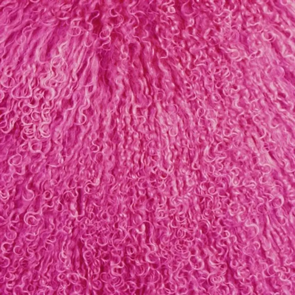 The hot pink Mongolain pillow is made from Mongolian sheep''s wool and is backed by a rich genuine suede leather in matching tone. The delightfully soft texture of this exclusive wool creates a powerful visual statement. Lifted by the slightest breeze the incredibly soft hairs dance lightly, entrancing any passerby. Its touchable and inviting look will add a dynamic yet soft and approachable element to your space. This pillow looks fabulous alone or with any of the other colors in the collection. This natural wool pillow''s generous proportion and amazing texture make it a center piece to any room.Features:-18" x 18" Pillow-Front: 100% Mongolian Sheepskin-Back: 100% Suede Finish Leather -Color matched, concealed Zipper Closure-Dry Clean Only-Filling: Polyester Fiber Fill • Pillow dimensions always refer to the pillow cover''s width and length while lying flat unstuffed and are rounded up to the nearest whole inch.