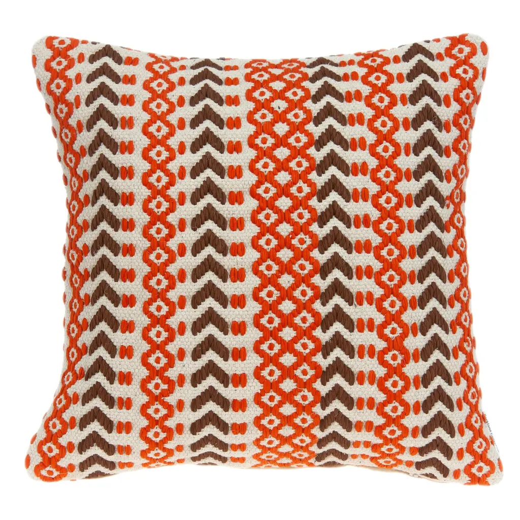 Bring warmth and texture to any space with this multicolor throw pillow. Features a bold geometric embroidery in shades of orange, beige, and brown. Meticulously woven for durability and style, this cotton pillow adds a touch of modern charm to sofas, chairs, or beds. The removable cover allows for easy cleaning, ensuring lasting beauty. This statement piece is as functional as it is stylish. Product Features: Color(s): orange, beige, and brown Showcases a Bohemian-style embroidered geometric pattern Design is on one side only Removable cover with zipper closure for easy cleaning Care instructions: machine wash in cold and line dry Recommended for indoor use Dimensions: 20"H x 20"W x 7"D Material(s): Shell: cotton Filling: polyester