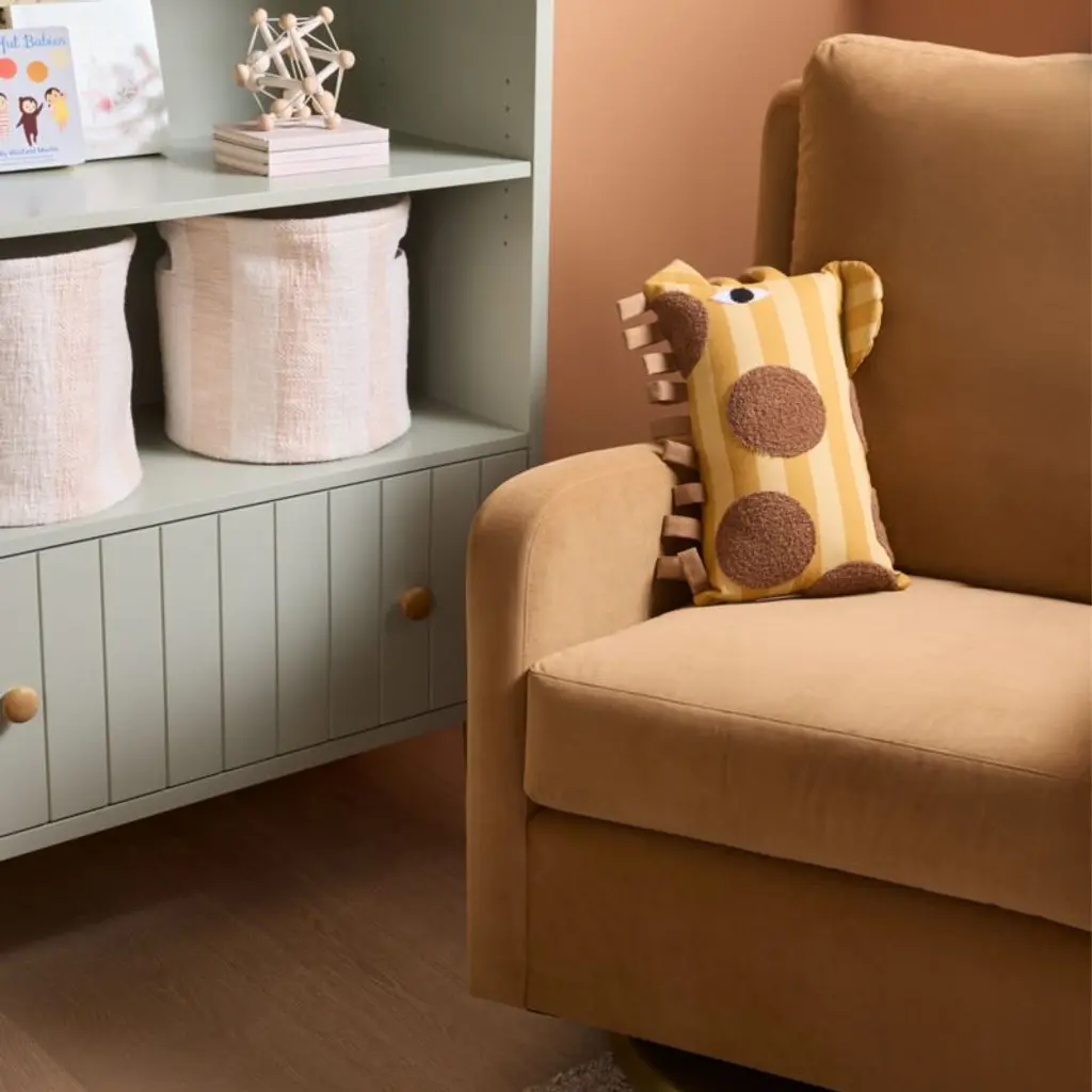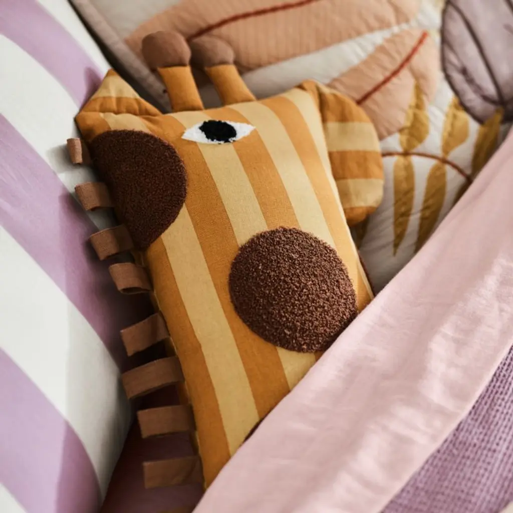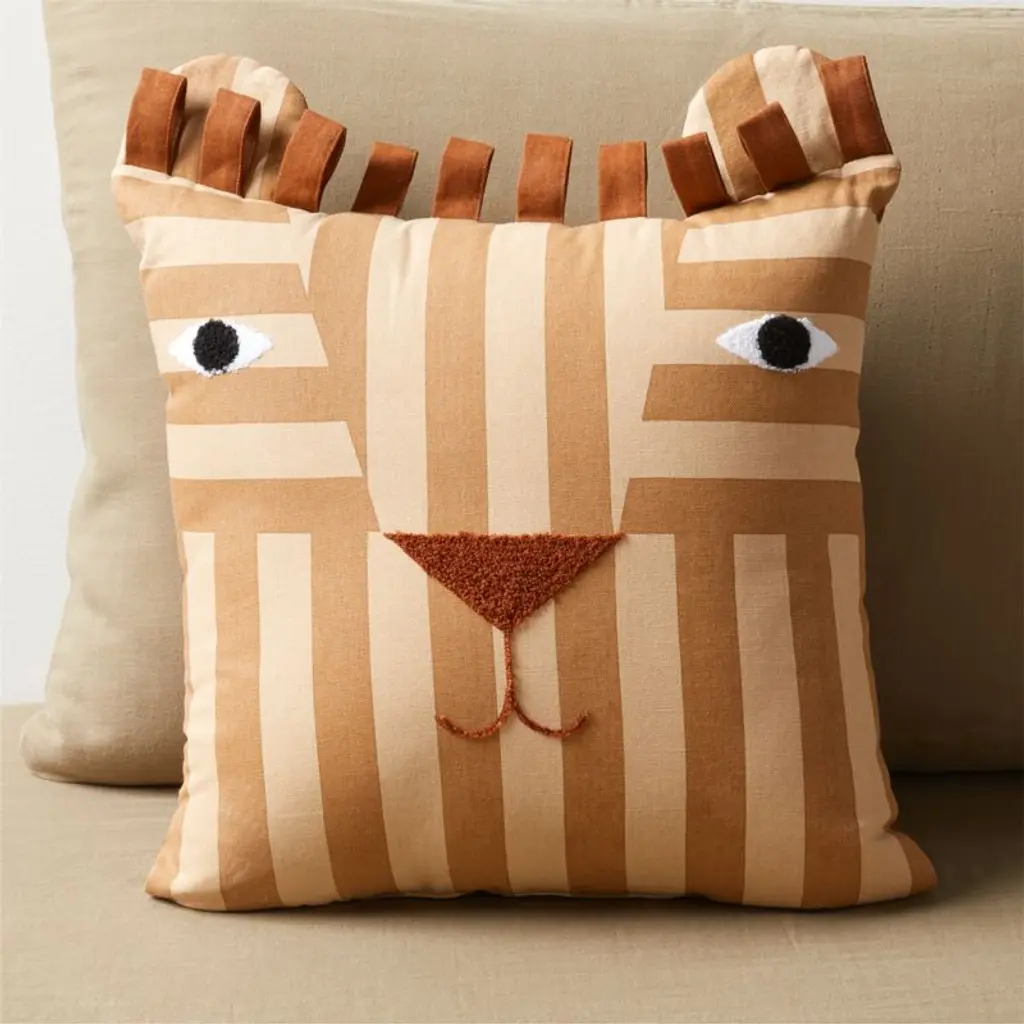 Decorate the nursery or kid's room for your little animal lover with our playful striped giraffe pillow. Made of sturdy yet smooth cotton canvas, the pillow features crewel embroidery details for added texture. With sweet eyes, a cute pointed nose and oh-so-fun 3D details, the unique design will add individuality to any budding zoologist's space.
