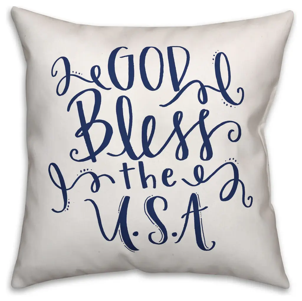 This indoor/outdoor pillow features a white background with a blue script "God Bless the USA" to help you add some fun to your home. This design is printed using a printing process that ensures the most vibrant colors are displayed on the fabric. The outcome is irresistible artistry that ensures a lasting impact on your home. Made to order.