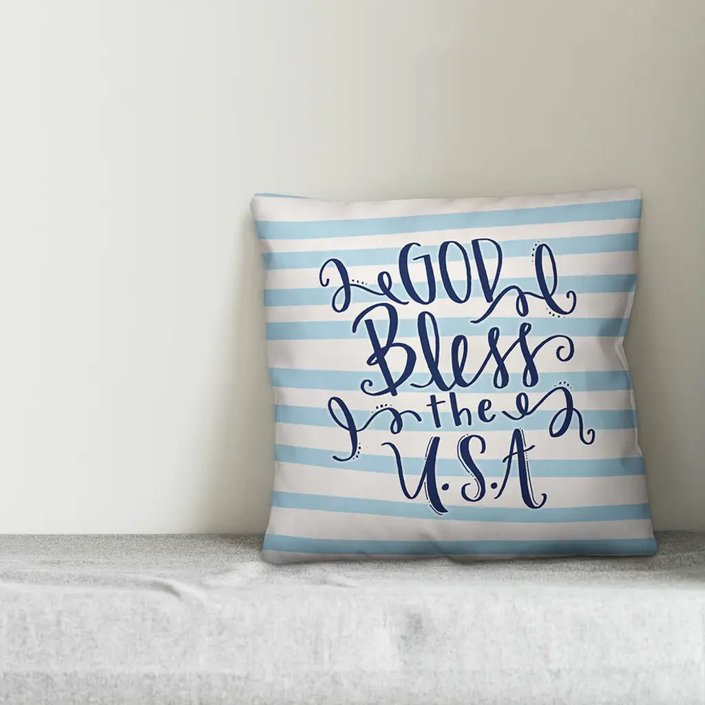 This polyester pillow features a white background with a blue script "God Bless the USA" and light blue stripes in the background to help you add some fun to your home. This design is printed using a printing process that ensures the most vibrant colors are displayed on the fabric. The outcome is irresistible artistry that ensures a lasting impact on your home. Made to order.