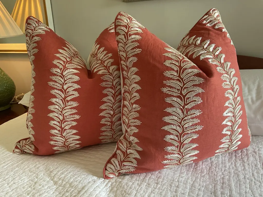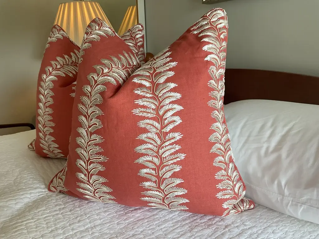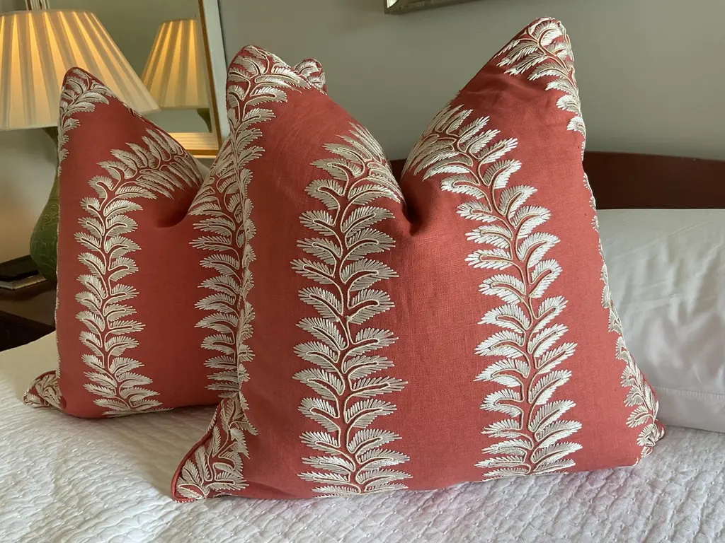 Timeless botanical elegance with artisanal charm.Elevate your interiors with the refined beauty of Bradbourne Embroidery by GP & J Baker, presented here in the radiant Coral colourway. This exquisite fabric features delicately embroidered botanical motifs — inspired by natural fern fronds — arranged in elegant vertical stripes that lend both structure and softness to any scheme.Set against a warm, sun-kissed coral ground, the embroidery is executed in a soft ivory thread, creating a graceful contrast and a tactile, dimensional finish. Each detail reflects GP & J Baker’s heritage of fine British textile design, with a look that’s equally at home in classic or contemporary interiors.These will come as a 22" pair of covers with plush down inserts. S
