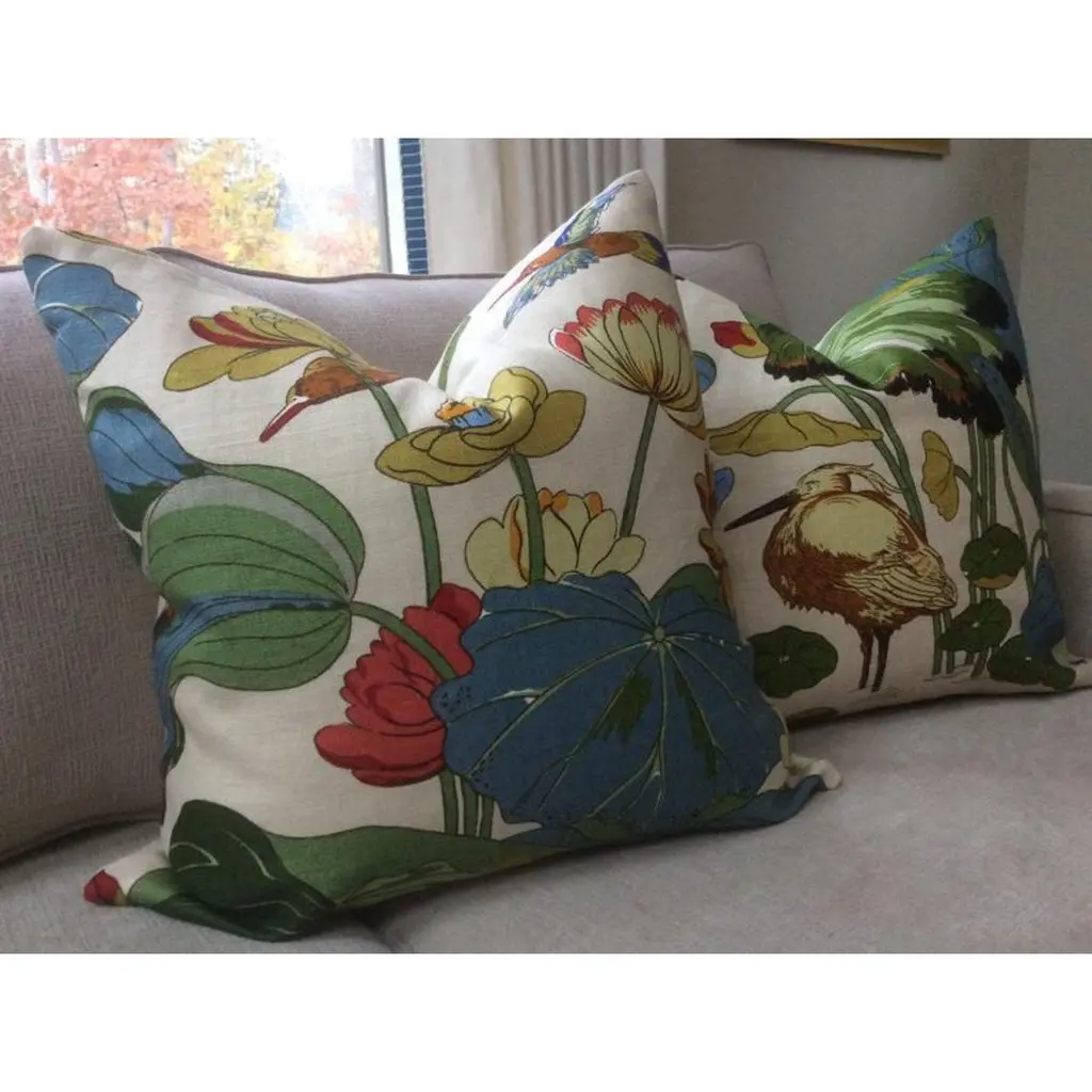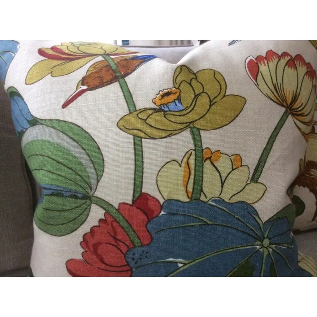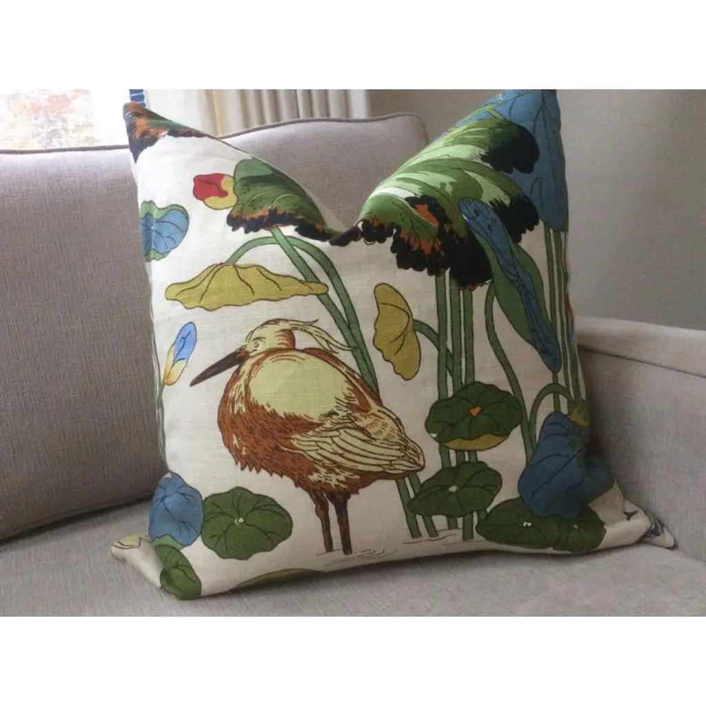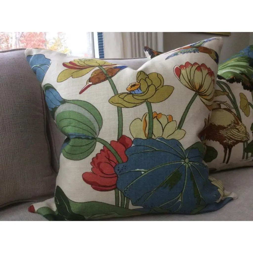 From inimitable design house, GP & J Baker, comes one of their most iconic prints in Stone/Pistachio colorway. “Nympheus” is a large-scale 100% Linen in vibrant shades of teal, blue, bottle green, ruby red, and straw gold on a creamy background. HANDS DOWN a most favorite all time fabric of Accent Marks. It features herons, lotus, and lilies - a beautiful mix.This listing will arrive as a pair of 22” down filled pillows. They will be backed in a coordinating black linen and closed by way of an invisible zipper. Complete with generous down inserts, this set will arrive ready to use.Patterns will vary and pairs will coordinate, but will not match placement-wise.About UsAt Accent Marks, each designer pillow is crafted with care using the finest hand-selected fabrics and trims, paired with durable, discreet invisible zippers. We specialize in creating beautiful, high-quality pieces that elevate your home decor. While most of our listings feature 22" pillow pairs, we also offer a range of sizes and single pillow options to suit your needs. All of our Accent Marks pillows are proudly made in the United States.If you don't see the fabric you're searching for, please reach out via message as we have other fabrics available upon request and can create anything that you like. Thank you for visiting Accent Marks!