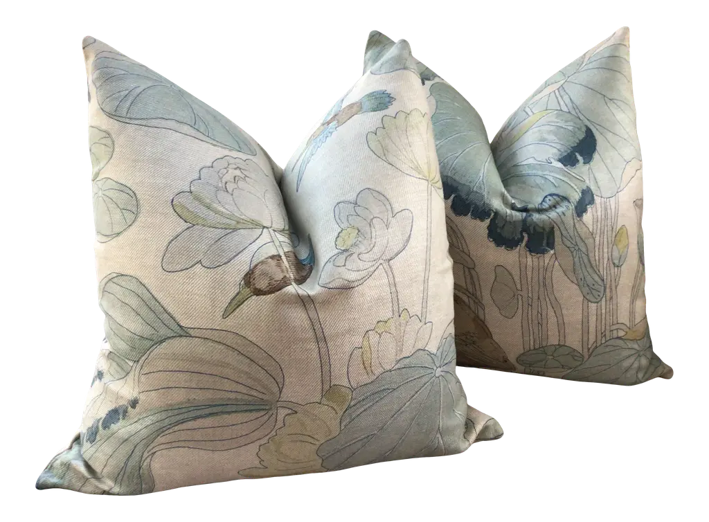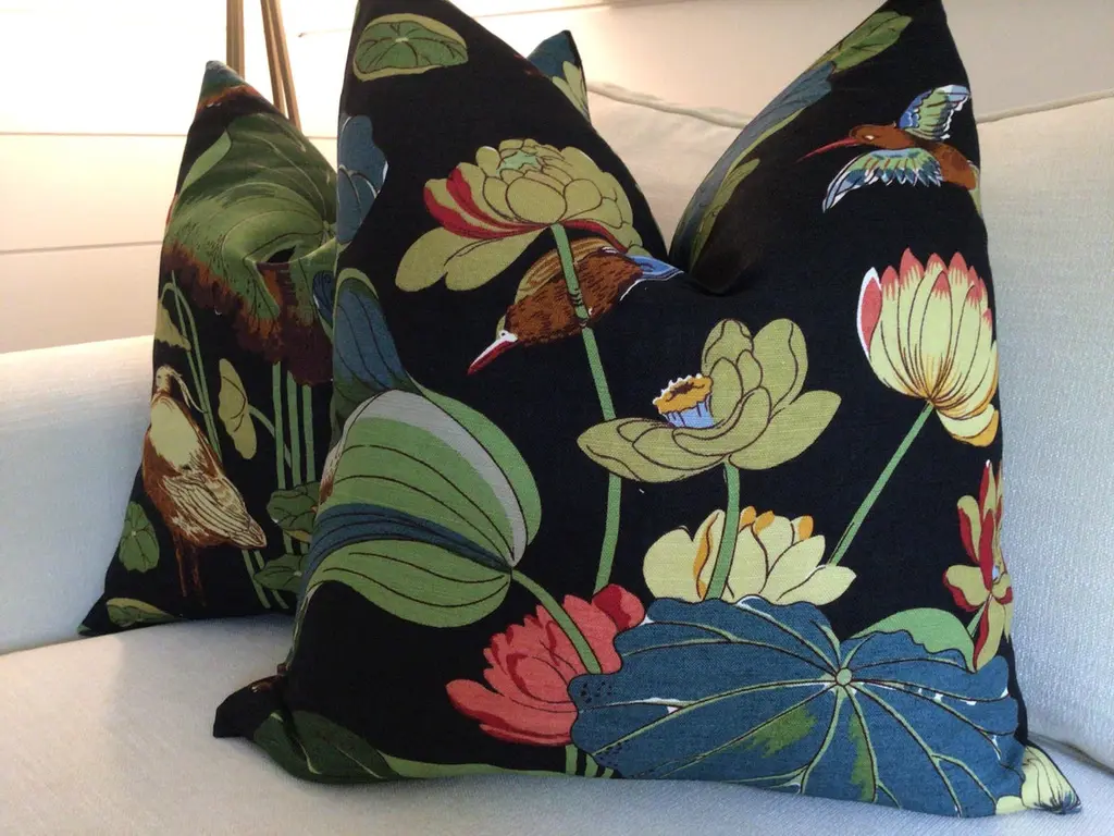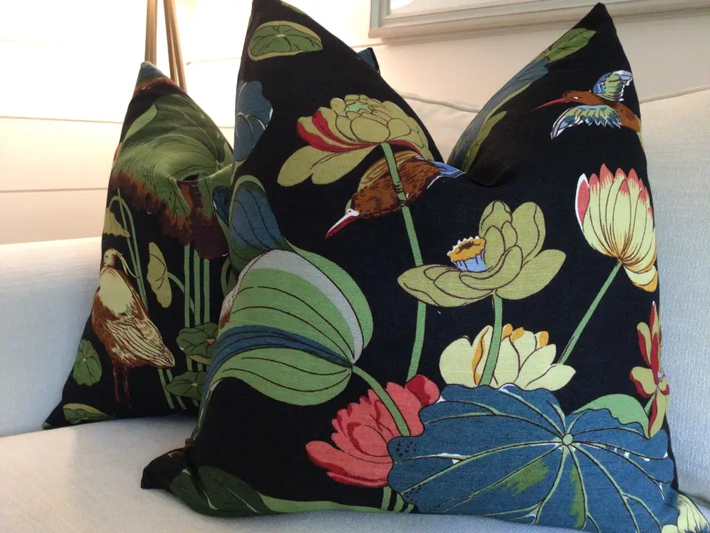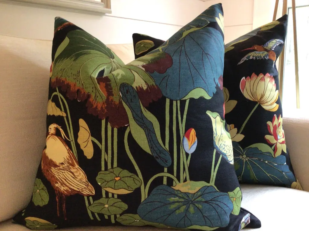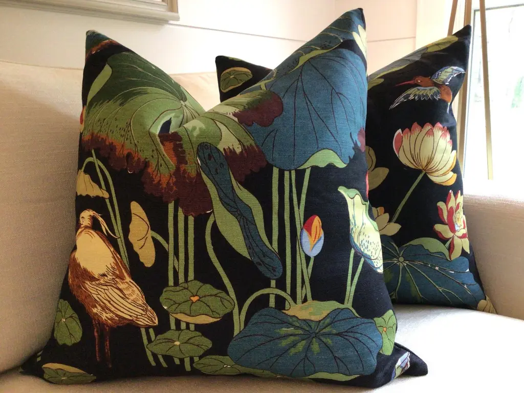 From inimitable design house, GP & J Baker, comes one of their most iconic prints in Teal/Green colorway. “Nympheus” is a large-scale 100% Linen with VIBRANT shades of teal, blue, bottle green, celadon gree, ruby red, and straw gold on a black background. HANDS DOWN a most favorite all time fabric of Accent Marks. It features herons, lotus, and lillies - a beautiful mix.This listing will arrive as a pair of 22” down filled pillows. They will be backed in a coordinating black linen and closed by way of an invisible zipper. Complete with generous down inserts, this set will arrive ready to use.Patterns will vary and pairs will coordinate, but will not match placement-wise.About UsAt Accent Marks, each designer pillow is crafted with care using the finest hand-selected fabrics and trims, paired with durable, discreet invisible zippers. We specialize in creating beautiful, high-quality pieces that elevate your home decor. While most of our listings feature 22" pillow pairs, we also offer a range of sizes and single pillow options to suit your needs. All of our Accent Marks pillows are proudly made in the United States.If you don't see the fabric you're searching for, please reach out via message as we have other fabrics available upon request and can create anything that you like. Thank you for visiting Accent Marks!
