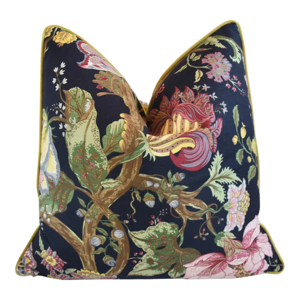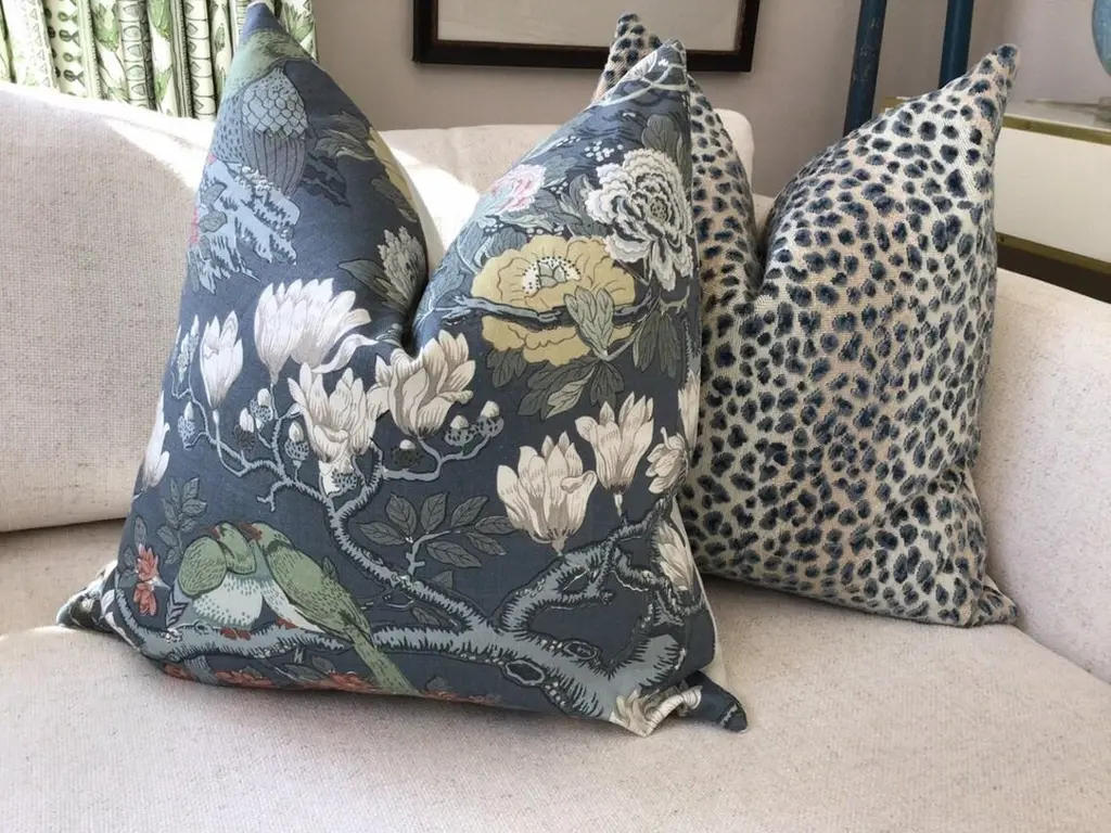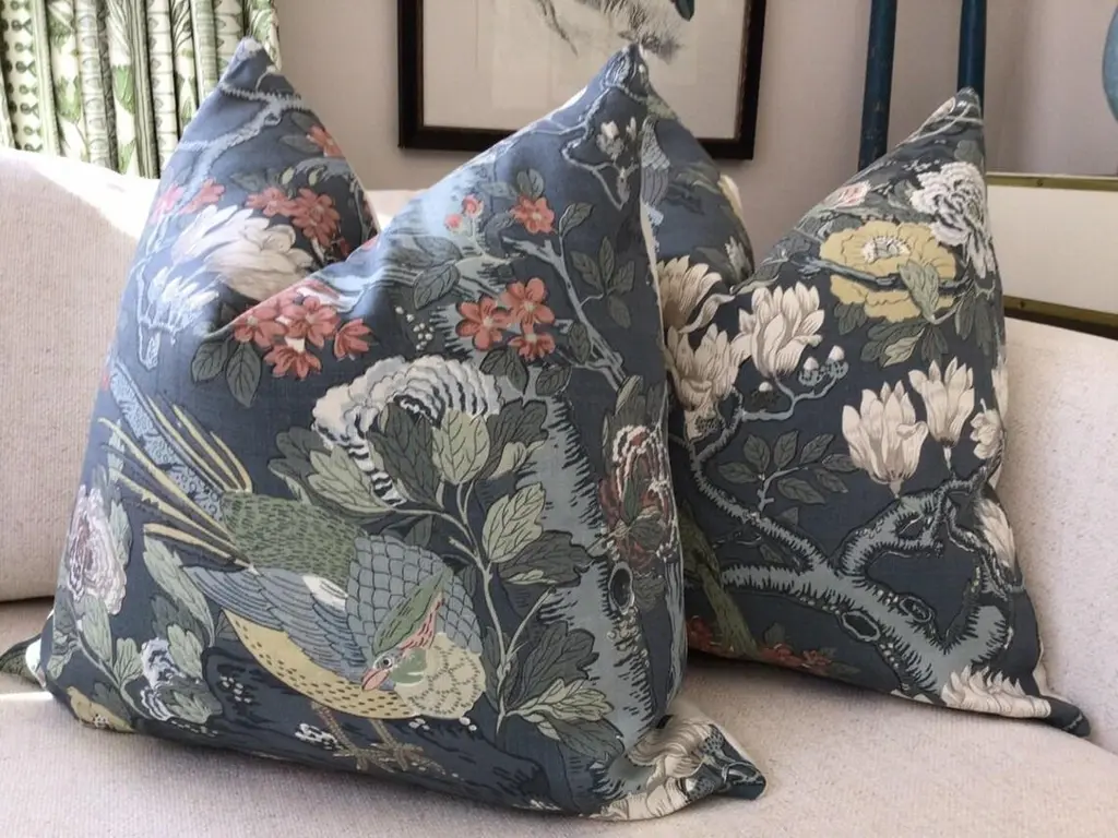 From GP & J Baker, "Rockbird Signature" has recently been reintroduced and is simply beautiful! Featuring shades of navy, pink, green, and teal, this heavyweight, 100% linen fabric depicts marsh and ocean life in a deft and subtle manner. GP & J Baker perfectly describes the scene as "bold drama".This set of pillows is a 22" pair with plush-down inserts and will have a coordinating solid color fabric linen back. The closure is by way of an invisible zipper. Dry Cleaning is recommended. Closure is by way of invisible zipper. Please note - placement will vary, but will always feature a centered scene. About UsAt Accent Marks, each designer pillow is crafted with care using the finest hand-selected fabrics and trims, paired with durable, discreet invisible zippers. We specialize in creating beautiful, high-quality pieces that elevate your home decor. While most of our listings feature 22" pillow pairs, we also offer a range of sizes and single pillow options to suit your needs. All of our Accent Marks pillows are proudly made in the United States.If you don't see the fabric you're searching for, please reach out via message as we have other fabrics available upon request and can create anything that you like. Thank you for visiting Accent Marks!