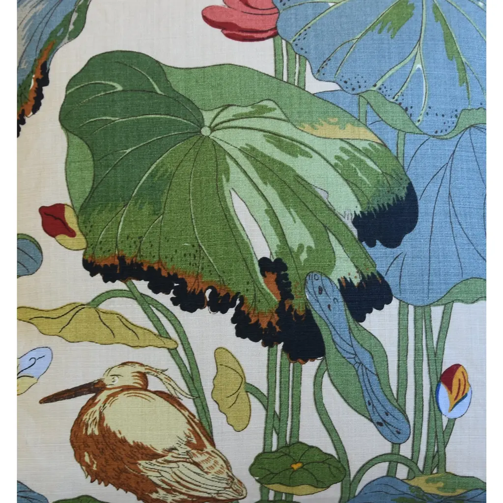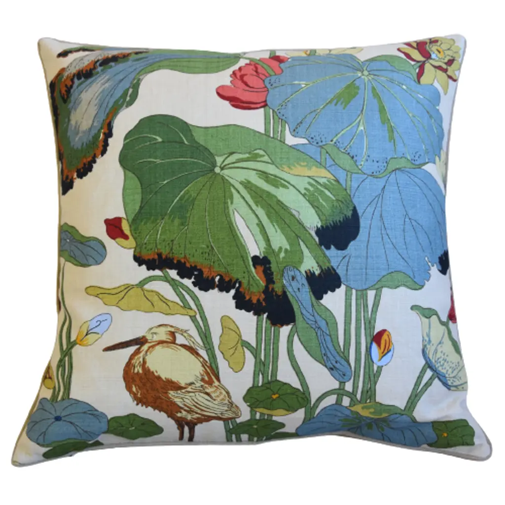 Custom-tailored pillow in GP & J Baker "Nympheus" linen fabric from their Enchantment Collection. Cream cotton-velvet fabric back. Custom cord trim. Zipper closure. New plump goose feather-and-down insert. Excellent new unused condition.