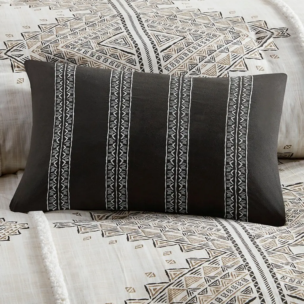 Elevate your bedroom with this soft microfiber artisan comforter set, featuring a printed global-inspired design with geometric patterns and stripes. Complete with white chenille trim and a dark throw pillow for contrast, the set offers a restful and comfortable sleeping experience.