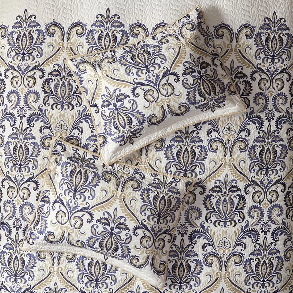 Elevate your space with the 6-piece reversible quilt set, designed to bring a touch of modern elegance into your home. This set features a white ground adorned with an updated paisley design in a harmonious palette of navy, blue, tan, and beige. The quilt's reverse side showcases a solid beige backing, ensuring the perfect balance of colors and patterns. To complete the contemporary aesthetic, three decorative pillows are included in the set, featuring intricate pleating and embroidery details that tie the entire look together. Redefine your living space with this stylish and versatile quilt set, blending comfort and sophistication effortlessly.