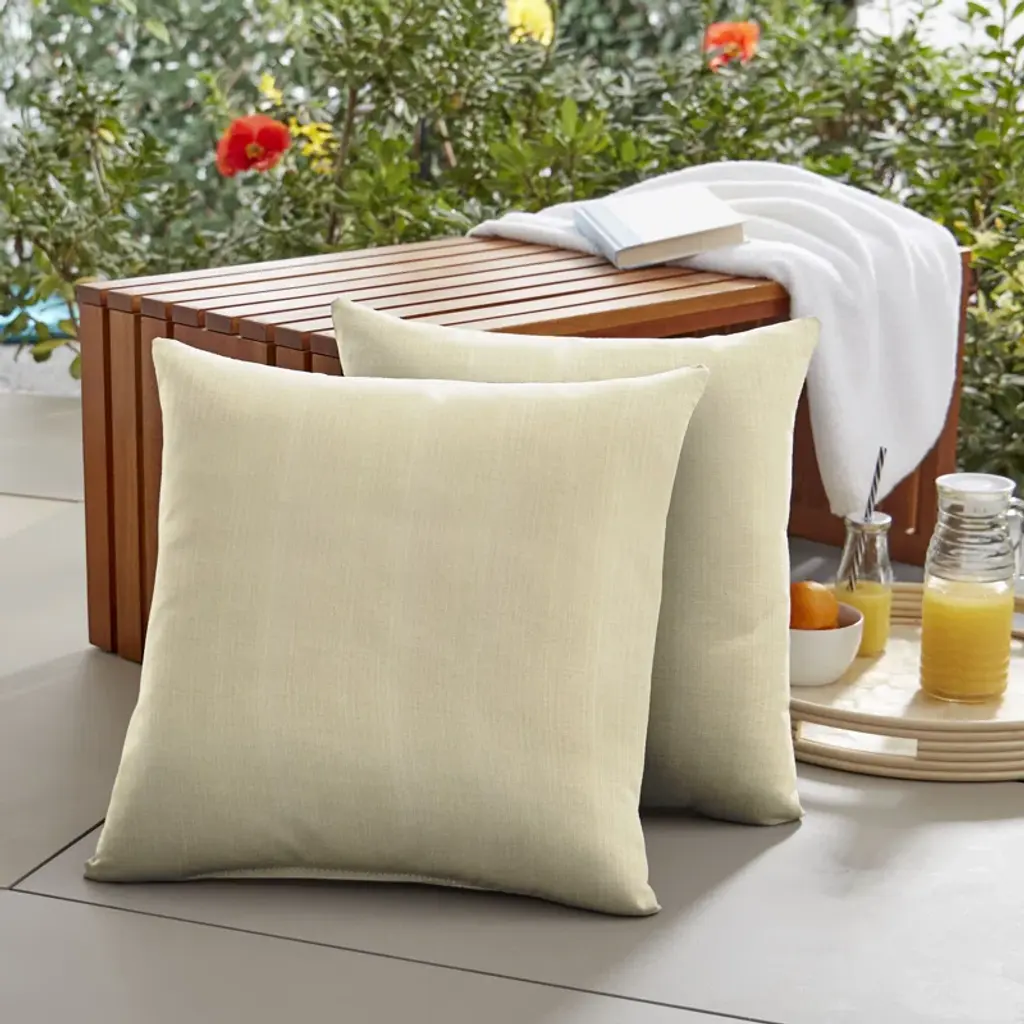 This 2-piece indoor/outdoor throw pillow set has a neutral green, tan, and ivory palette that make it a key ingredient to any space in your home, from the living room to the back patio. Each reversible square pillow is wrapped in weather-resistant Sunbrella fabric and filled with a sewn-in 100% recycled fiber insert, so they're sure to stand up to little ones and UV rays beaming down when left outdoors. And when this accent pillow set needs some freshening up, simply spot clean it with a damp cloth.