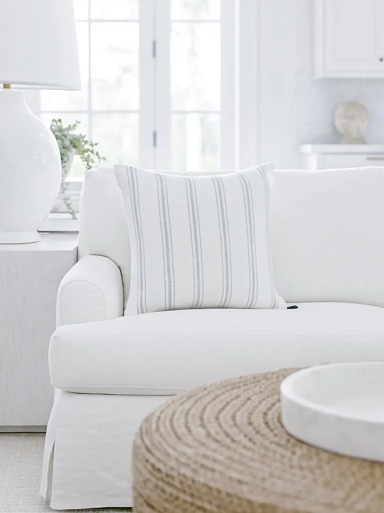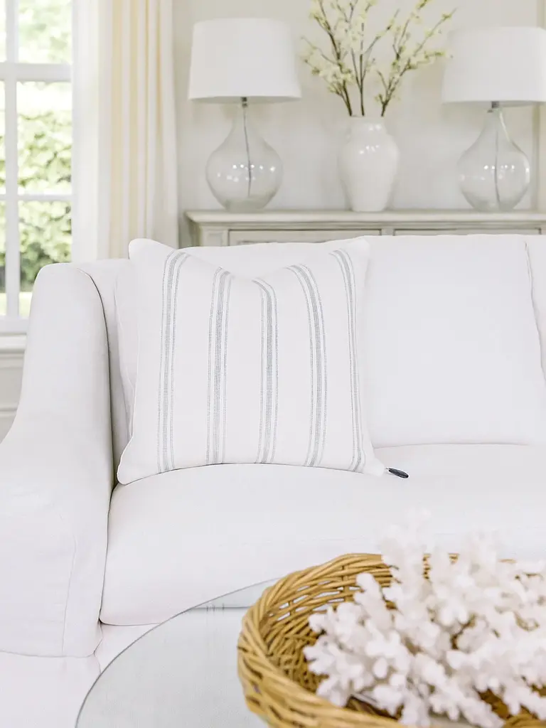 The Grey Petite Stripe Linen Pillow is Soo soft- you won’t believe it's linen! Size: 20"x20" DetailsFront & Back Color: WhiteEmbroidery: GreyTrim Details: GreyFront & Back side: 100% Linen (Pre-washed)Concealed zipper closure on back side.Spot Clean. Made in India. Pillows are available in 3 options:Pillow Cover Only, with a Down Alternative insert, or with a Down InsertDown Alternative InsertBenefits: Allergen free, Better back support, Retain their shapeInside Fill: 1.2 denier x1.25" polyester gelOuter Shell: 65% polyester/ 35% white cotton blendMade in the USA Down InsertBenefits: Durable, Easy to fluff and re-style, Retains heatInside Fill: 95% gray duck feathers and 5% goose downOuter Shell: 233-thread count 100% cotton fabric Made in the USA