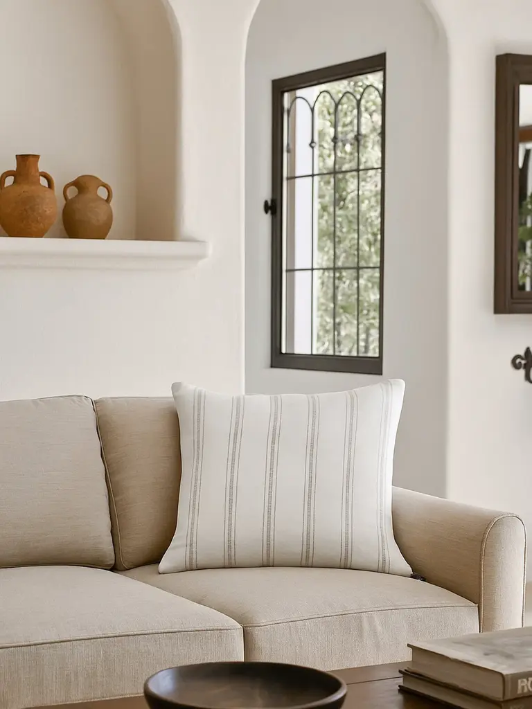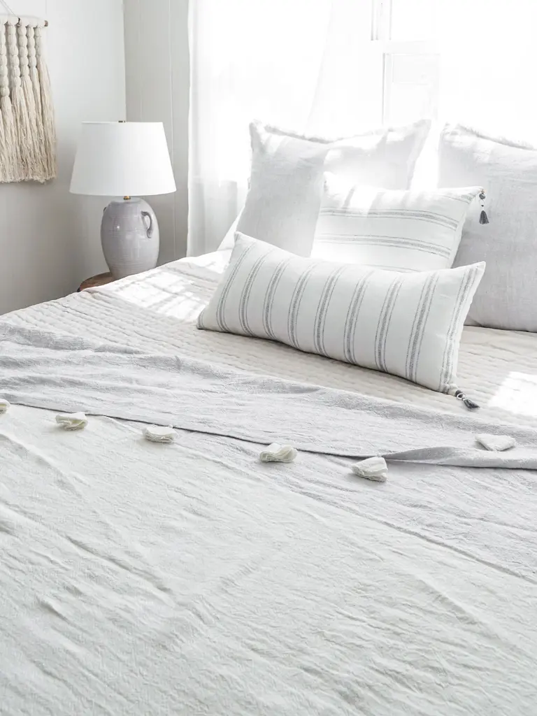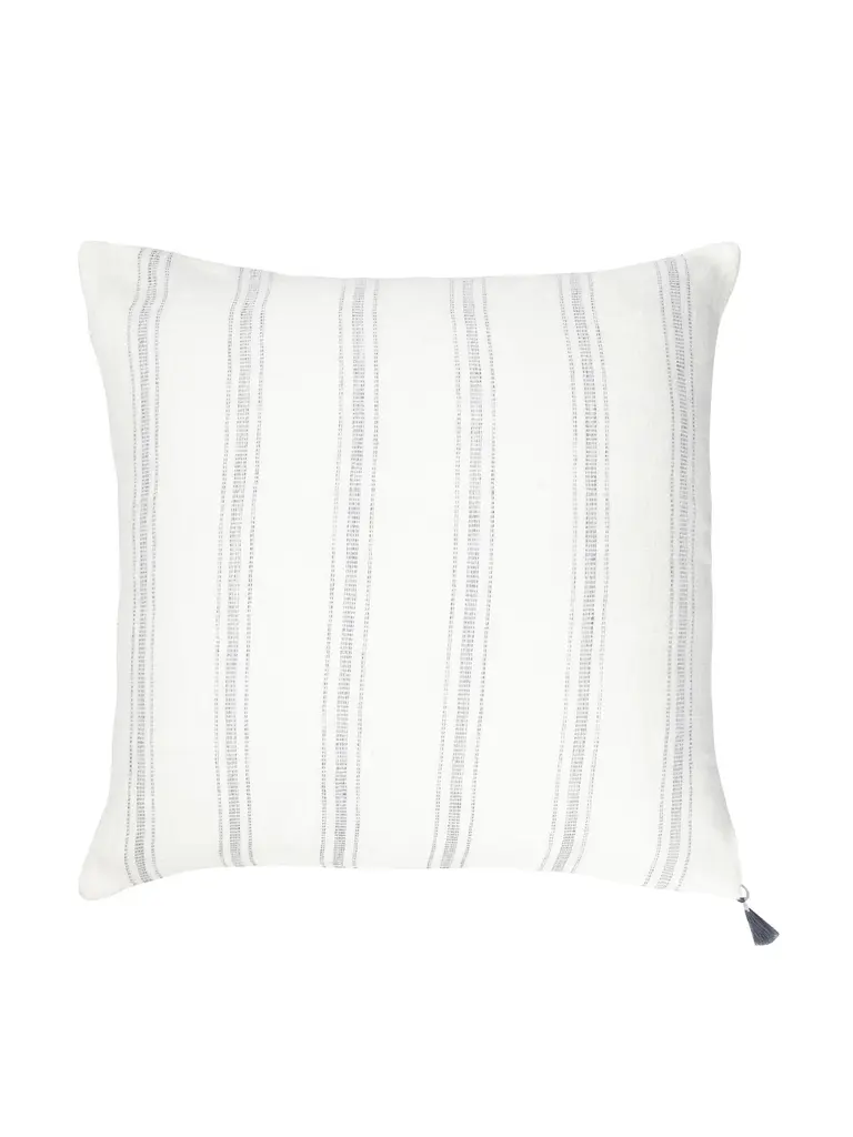 The Grey Petite Stripe Linen Pillow is Soo soft- you won’t believe it's linen! Size: 20"x20" DetailsFront & Back Color: WhiteEmbroidery: GreyTrim Details: GreyFront & Back side: 100% Linen (Pre-washed)Concealed zipper closure on back side.Spot Clean. Made in India. Pillows are available in 3 options:Pillow Cover Only, with a Down Alternative insert, or with a Down InsertDown Alternative InsertBenefits: Allergen free, Better back support, Retain their shapeInside Fill: 1.2 denier x1.25" polyester gelOuter Shell: 65% polyester/ 35% white cotton blendMade in the USA Down InsertBenefits: Durable, Easy to fluff and re-style, Retains heatInside Fill: 95% gray duck feathers and 5% goose downOuter Shell: 233-thread count 100% cotton fabric Made in the USA