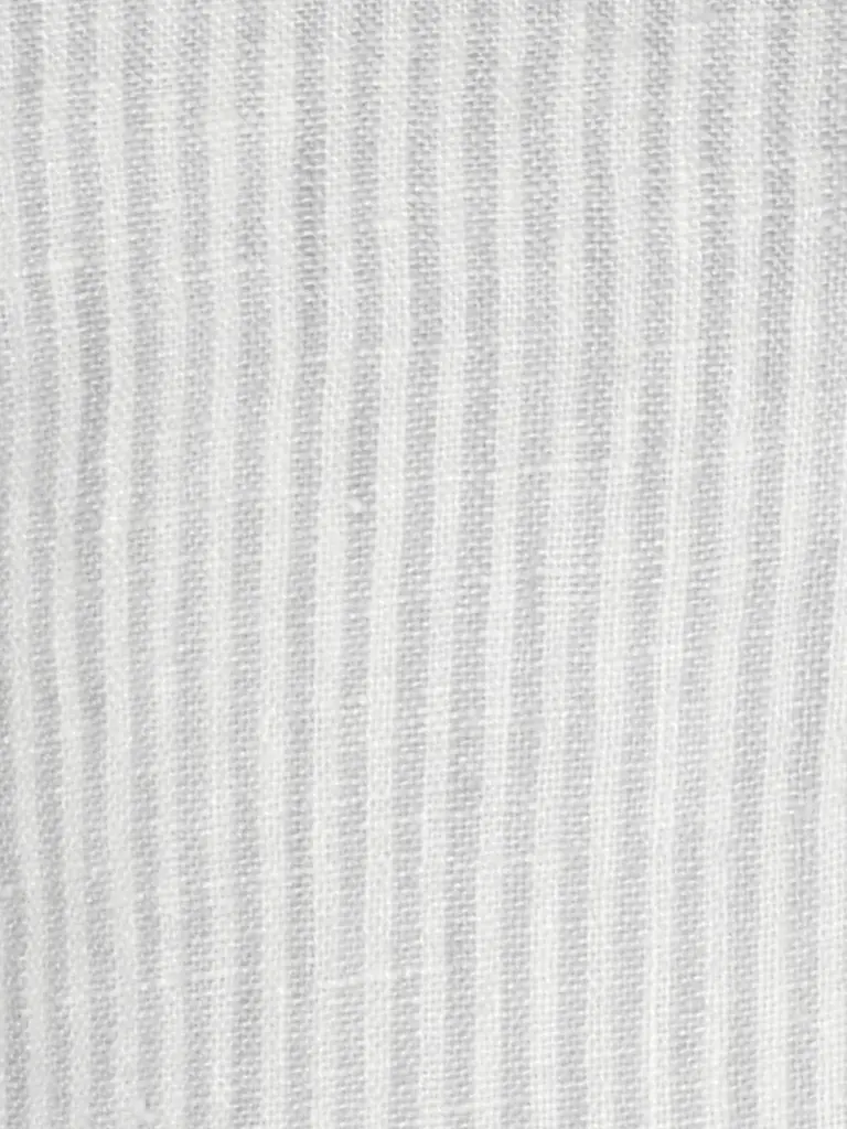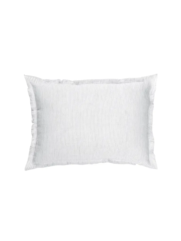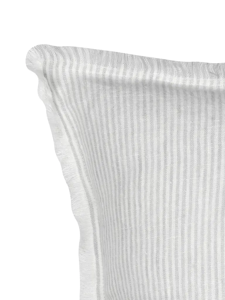 Our Grey Pinstripe Fringe So Soft Linen Pillow is Soo soft- you won’t believe it's linen! This yarn has a slight nub which gives it a beautiful natural texture which is woven into a classic pinstripe pattern. Edges have a self-fringe on all sides. DetailsFront & Back Color: Light Grey & White PinstripeFront & Back side: 100% Linen (washed)Concealed zipper closure on back side.Hand washing or a delicate cycle with like colored fabrics recommended. Hang to Dry.Made in India Pillows are available in 3 options:Pillow Cover Only, with a Down Alternative insert, or with a Down InsertDown Alternative InsertBenefits: Allergen free, Better back support, Retain their shapeInside Fill: 1.2 denier x1.25" polyester gelOuter Shell: 65% polyester/ 35% white cotton blendMade in the USA Down InsertBenefits: Durable, Easy to fluff and re-style, Retains heatInside Fill: 95% gray duck feathers and 5% goose downOuter Shell: 233-thread count 100% cotton fabric Made in the USA