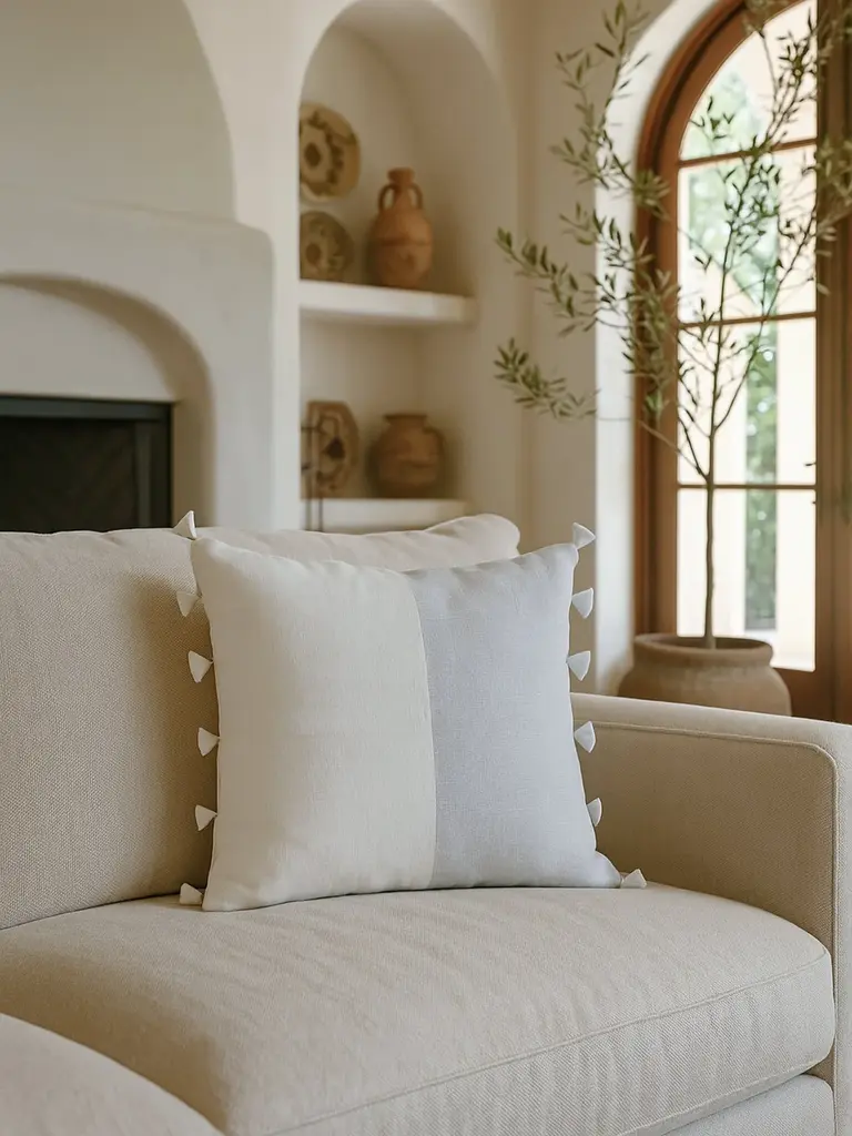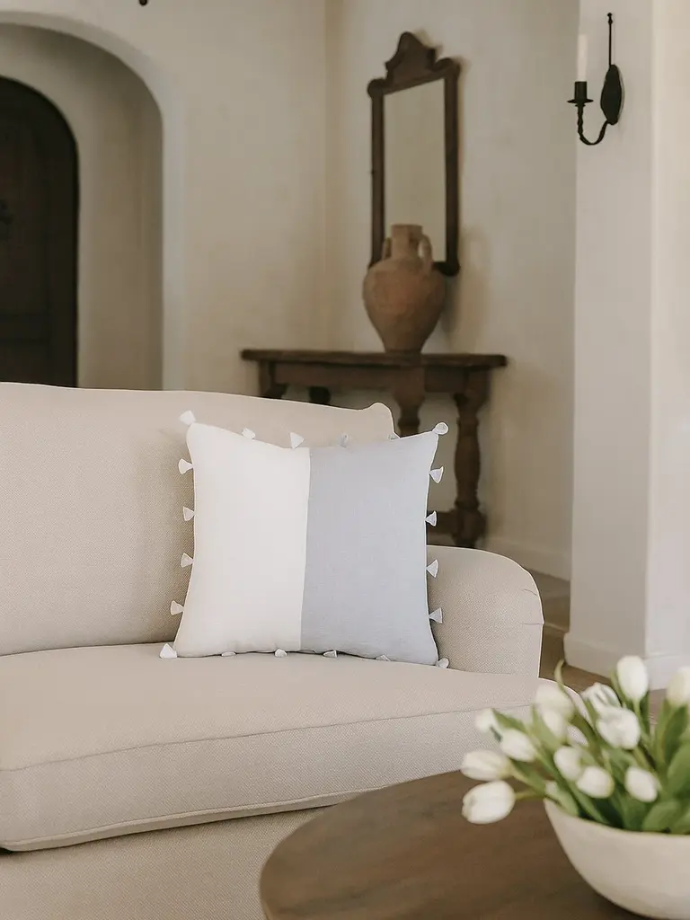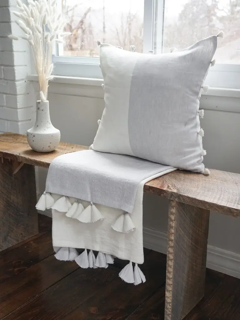 The Light Grey Tassels So Soft Linen Pillow is Soo soft- you won’t believe it's linen! DetailsFront & Back Color: Light Grey & WhiteTassel Details: Light Grey & WhiteFront & Back side: 100% Linen (Pre-washed)Concealed zipper closure on back side.Spot Clean. Made in India Pillows are available in 3 options:Pillow Cover Only, with a Down Alternative insert, or with a Down InsertDown Alternative InsertBenefits: Allergen free, Better back support, Retain their shapeInside Fill: 1.2 denier x1.25" polyester gelOuter Shell: 65% polyester/ 35% white cotton blendMade in the USA Down InsertBenefits: Durable, Easy to fluff and re-style, Retains heatInside Fill: 95% gray duck feathers and 5% goose downOuter Shell: 233-thread count 100% cotton fabric Made in the USA