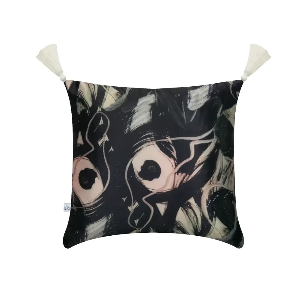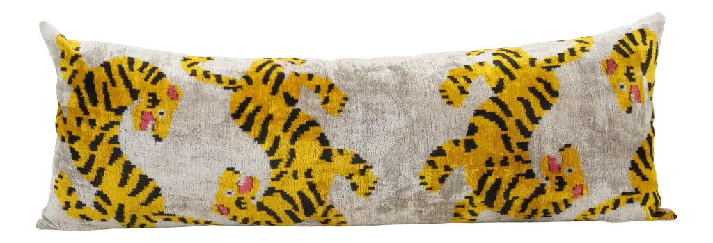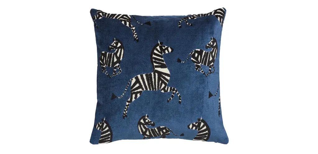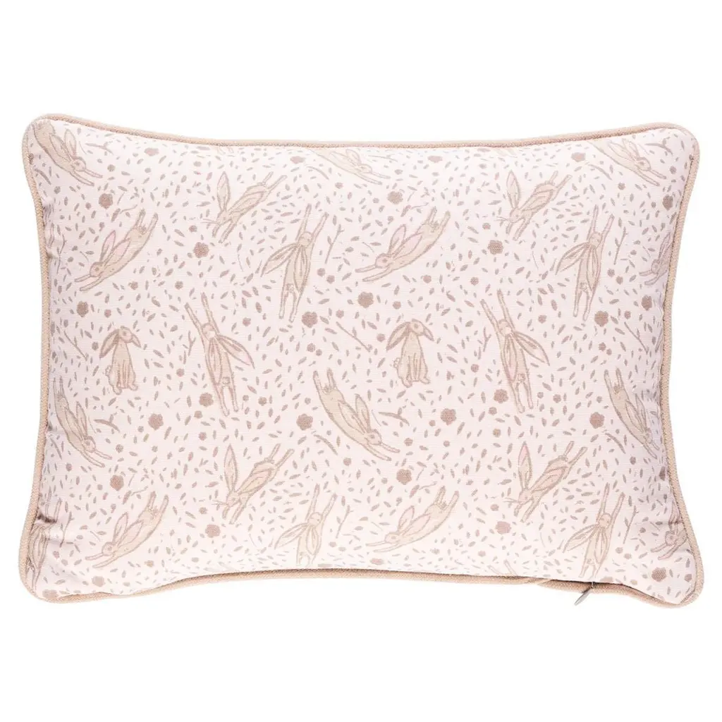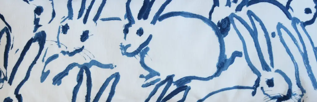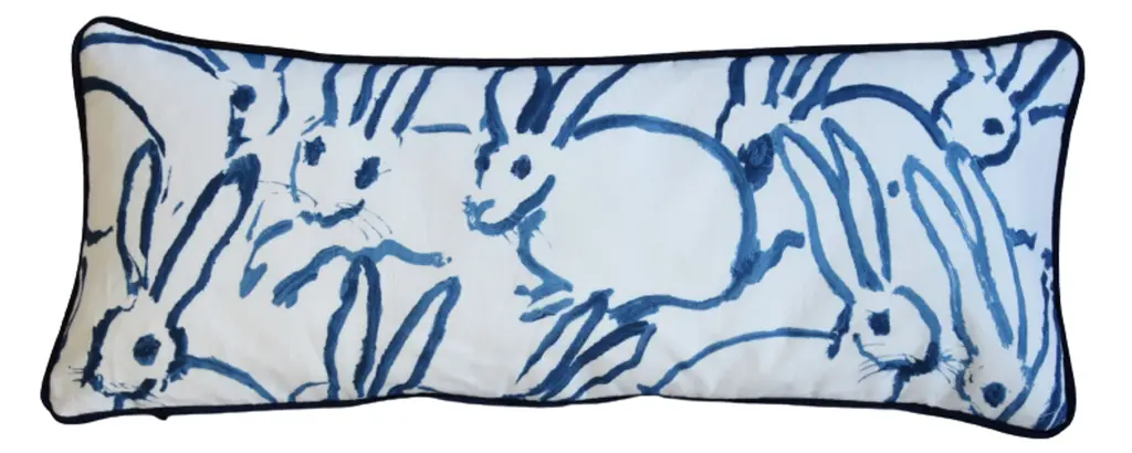 Custom-tailored pillow in designer Hunt Slonem's Lee Jofa Groundworks "bunny hutch" linen fabric depicting abstract bunnies on a white background. Blue cotton-velvet fabric back. Custom velvet piping trim. Zipper closure. Generous plump goose feather-and-down insert. Excellent new unused condition.