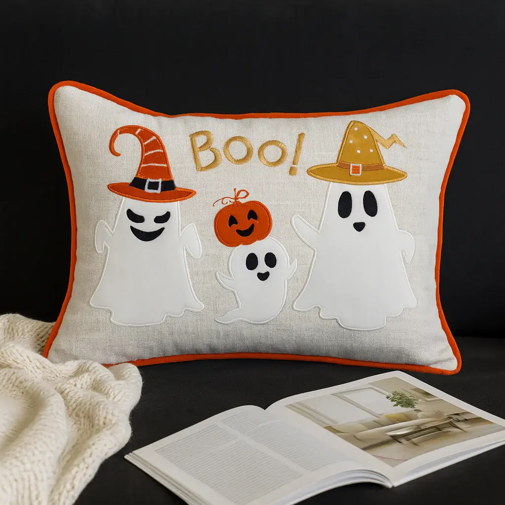 Fall, Halloween, and Thanksgiving-themed ghost design. Durable removable velvet cover with bright orange piping. Includes 14x20 polyester-filled insert for immediate use. Pillow insert is pre-inserted and should be re-fluffed after shipping. Perfect for family-friendly Halloween decorating and seasonal fun