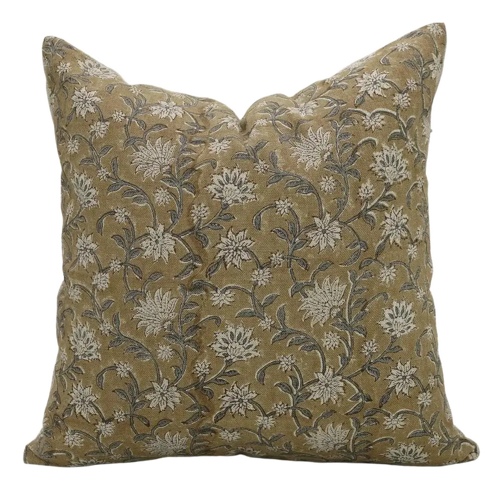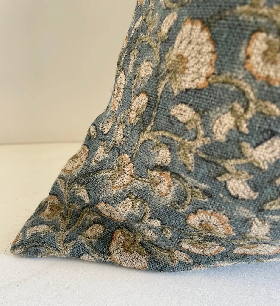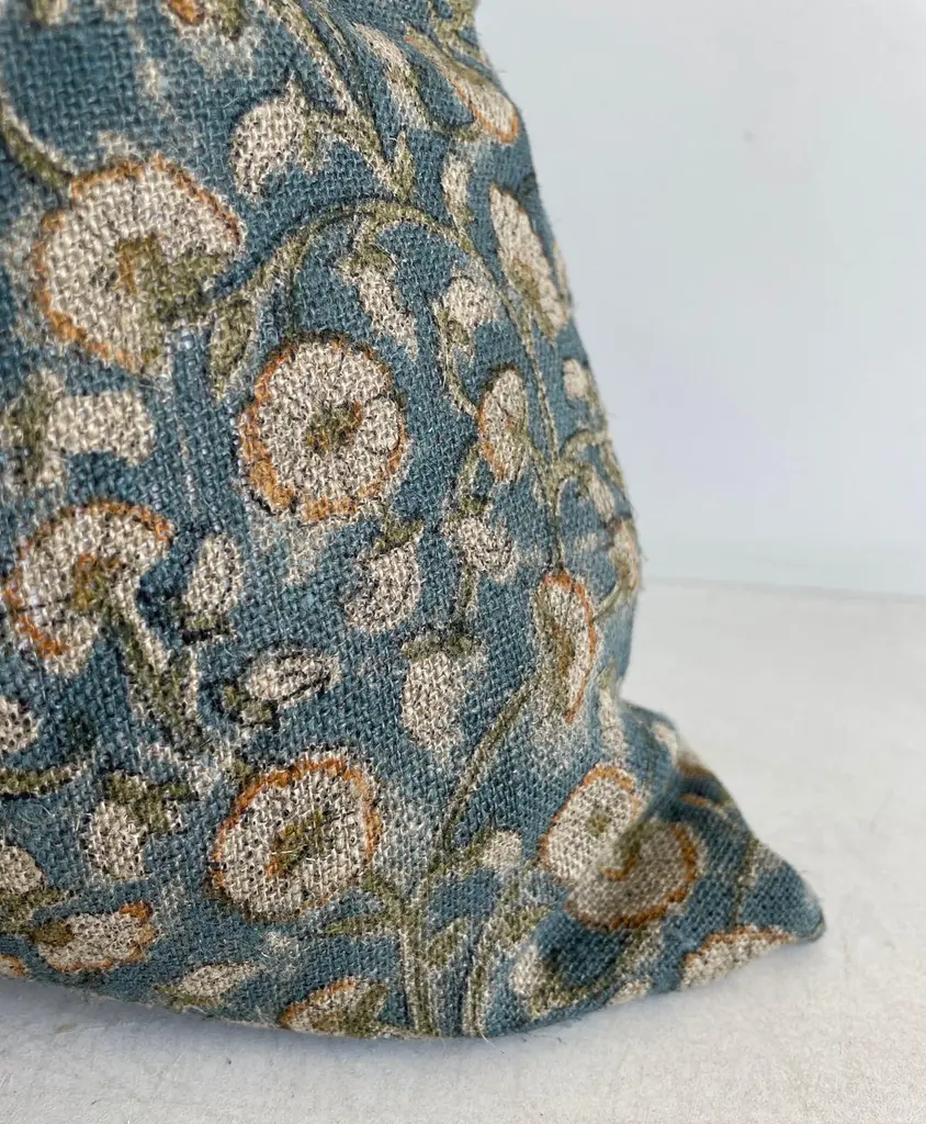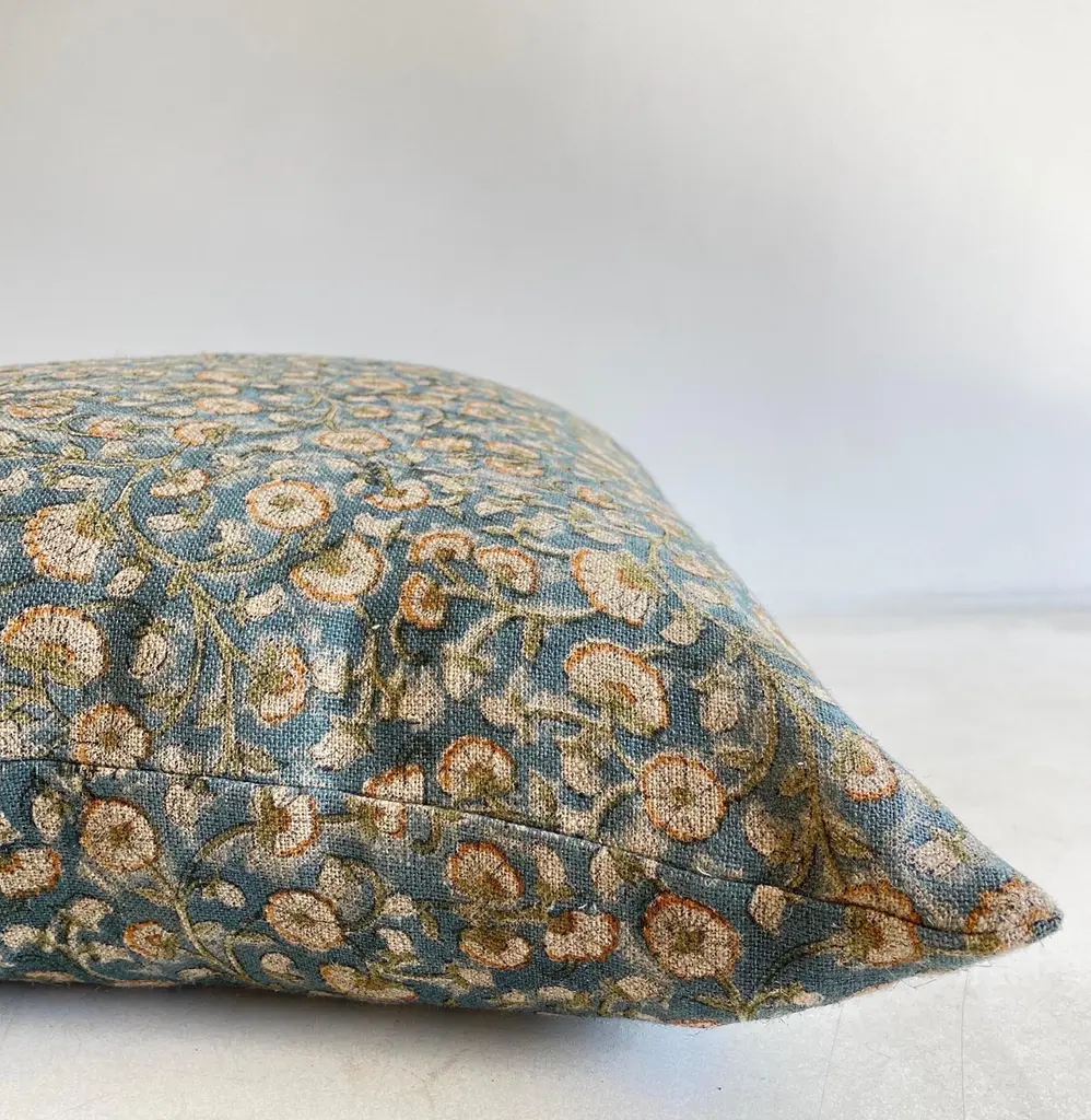 Beautifully hand block-printed pillow on heavy linen fabric. Zipper closure. Care instructions: dry clean recommended Includes down insert.Colors: French blue, gold (marigold), on flax natural linen.Size: 22” x 22”.Please allow 6-10 weeks from time of purchase for production. This item is considered custom order and is final sale.
