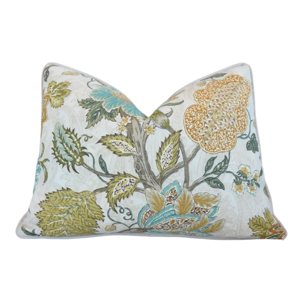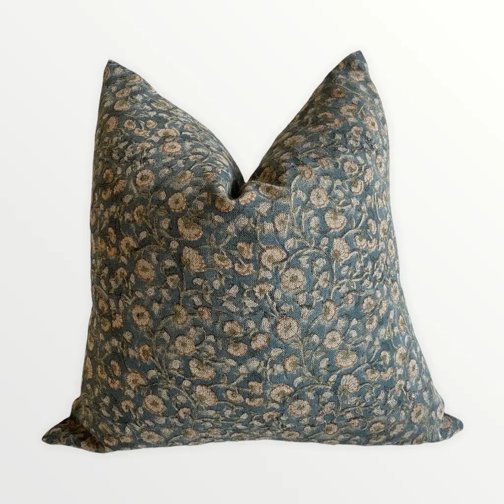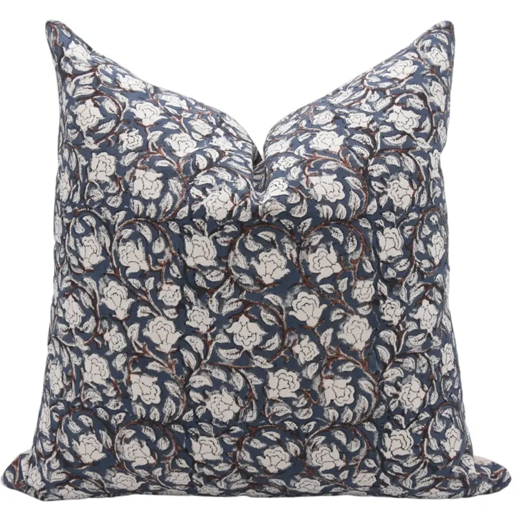 Beautifully hand block-printed pillow on heavy linen fabric. Zipper closure. Care instructions: dry clean recommended Includes down insert.Colors: French blue, gold (marigold), on flax natural linen.Size: 22” x 22”.Please allow 6-10 weeks from time of purchase for production. This item is considered custom order and is final sale.