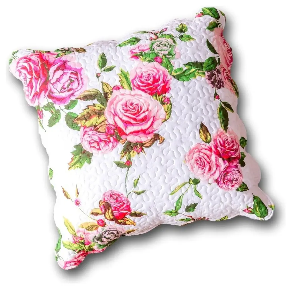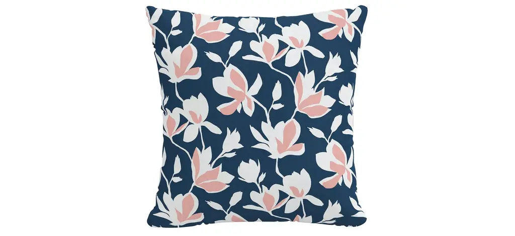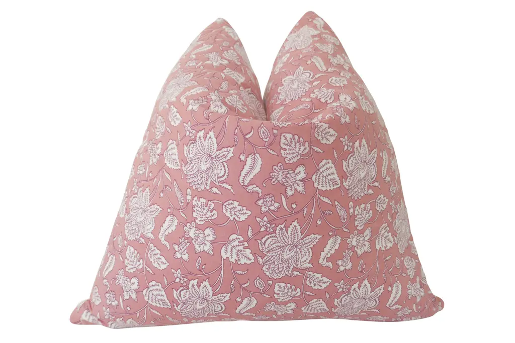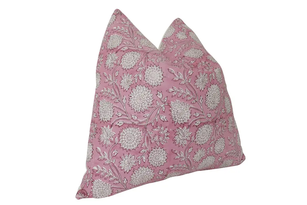24"x24" large pillow, impeccably created from authentic hand-block floral pattern pure cotton. Paired with premium white linen on reverse side. Plush Ultra-Plump down-and-feather insert, invisible zipper closure.