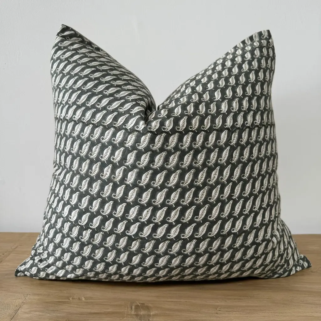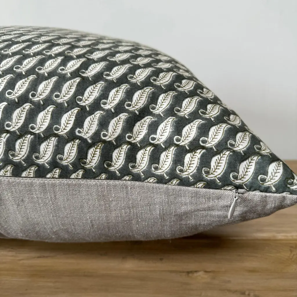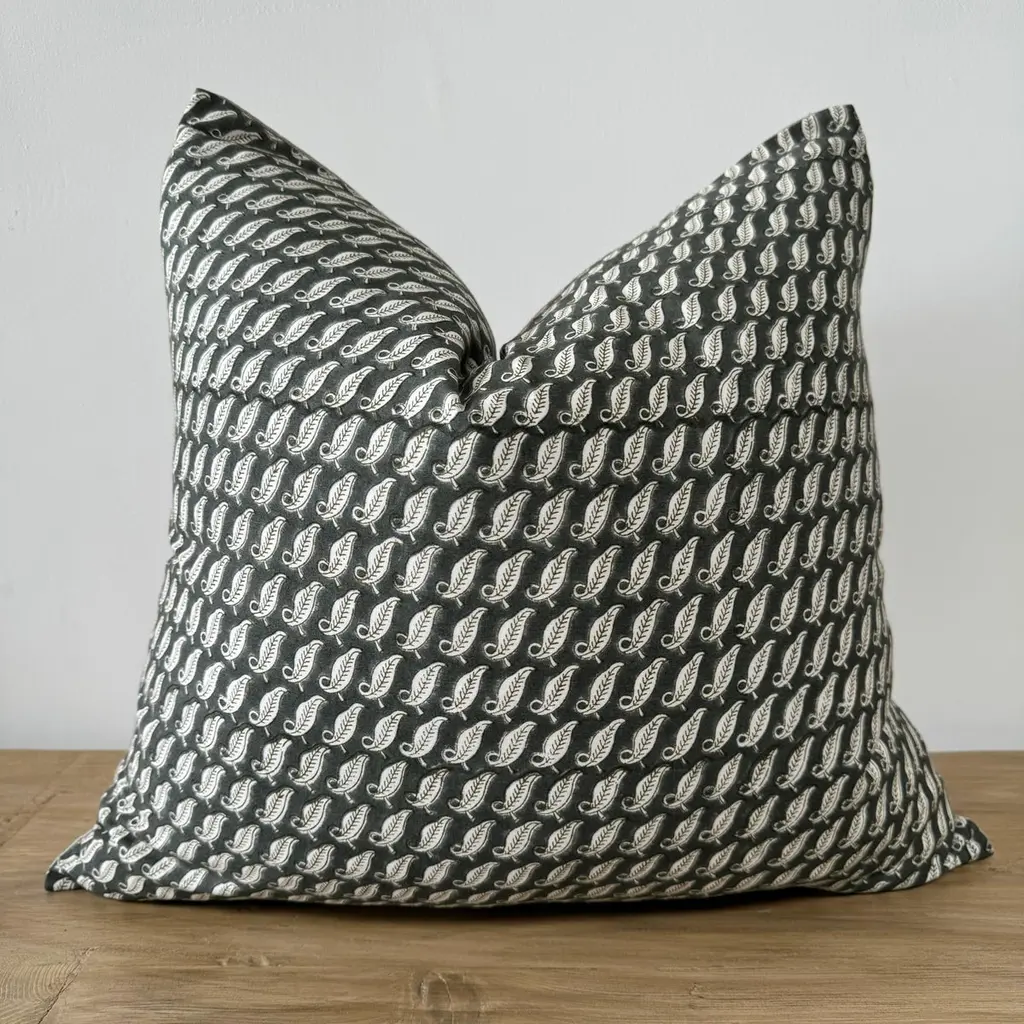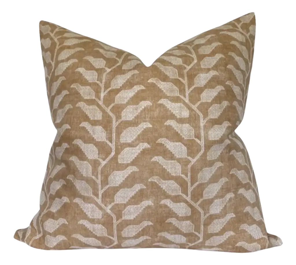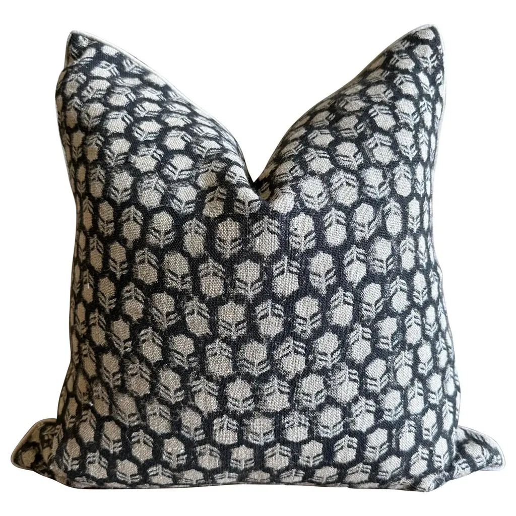 Our latest collection of beautiful hand blocked and linen pillows can be arranged to create beauty and bring a pop of color to your room while adding softness! On the Back: 100% Natural Linen Fabric.-Pattern placement WILL vary.-Includes a feather down insert. -Suggested Care Instructions: Spot or dry clean ONLY.Size: 22" x 22"