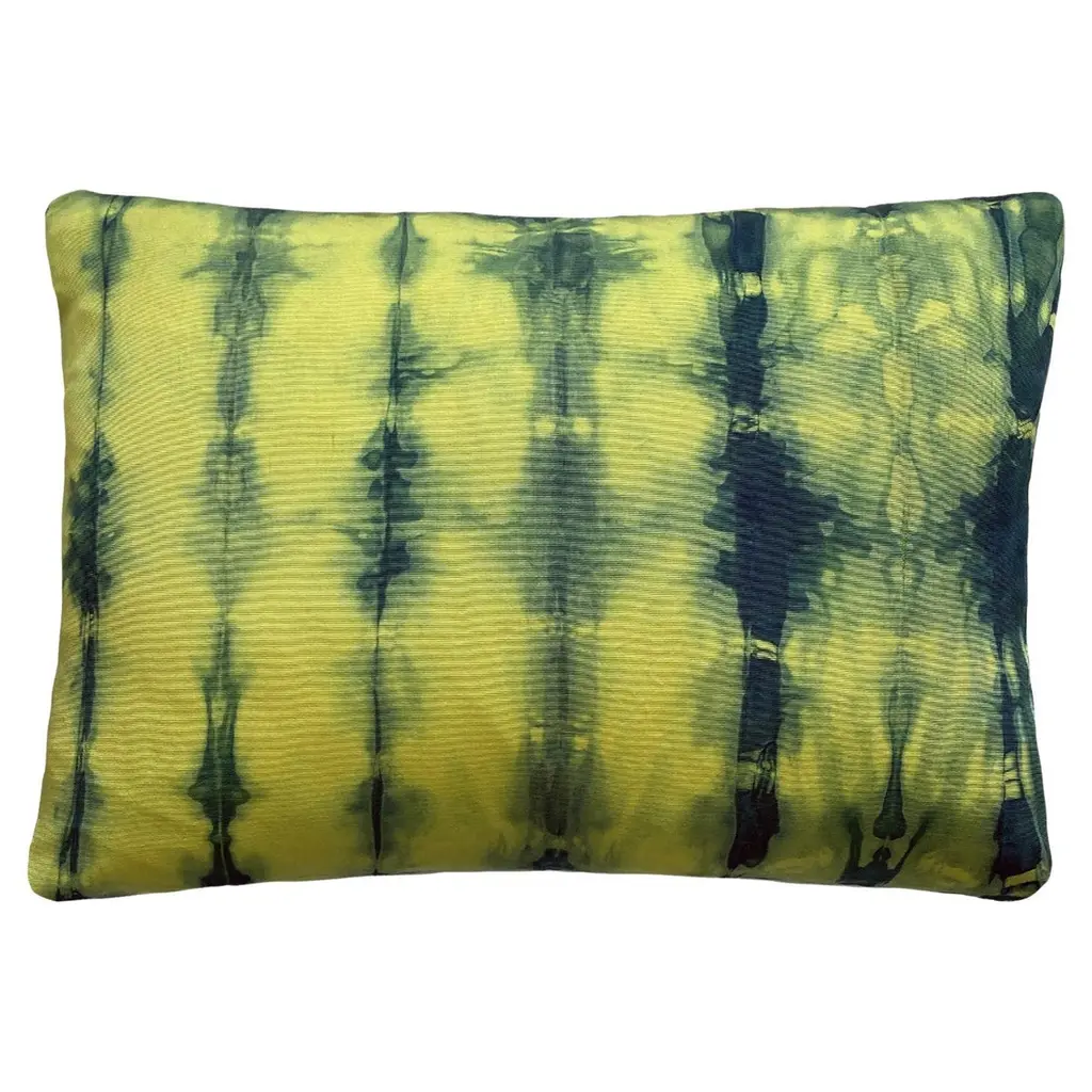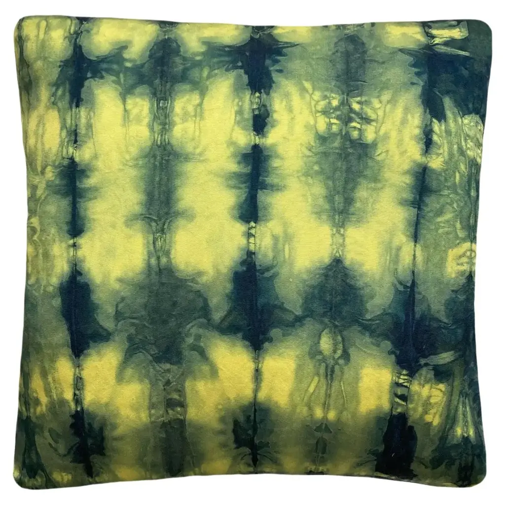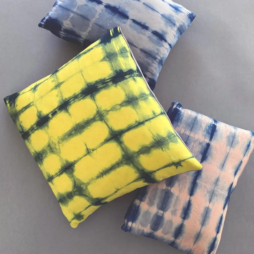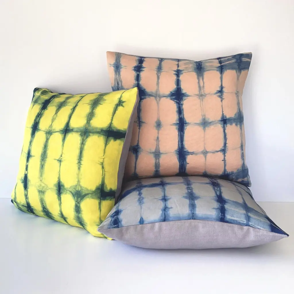 Canary yellow silk faille pillow dyed with indigo in Grid pattern with gray linen backing. Hand-dyed and sewn in New York City, down pillow insert made locally in NYC. Pillow measures 18 x 18 inches. Each silk pillow is hand made and one of a kind.Custom colors and sizes available. Please message to inquire about custom orders.Each silk pillow is cut and folded by hand, in the shibori style, before it is dyed through a series of indigo dips. To achieve a rich blue color, each panel is dipped and oxidized several times, before setting, hand-washing and drying. Note: Invisible zip closure at bottom of pillow. Slight variations may occur within the design. Care Instructions: Spot treat only. Do not dry clean or machine wash.