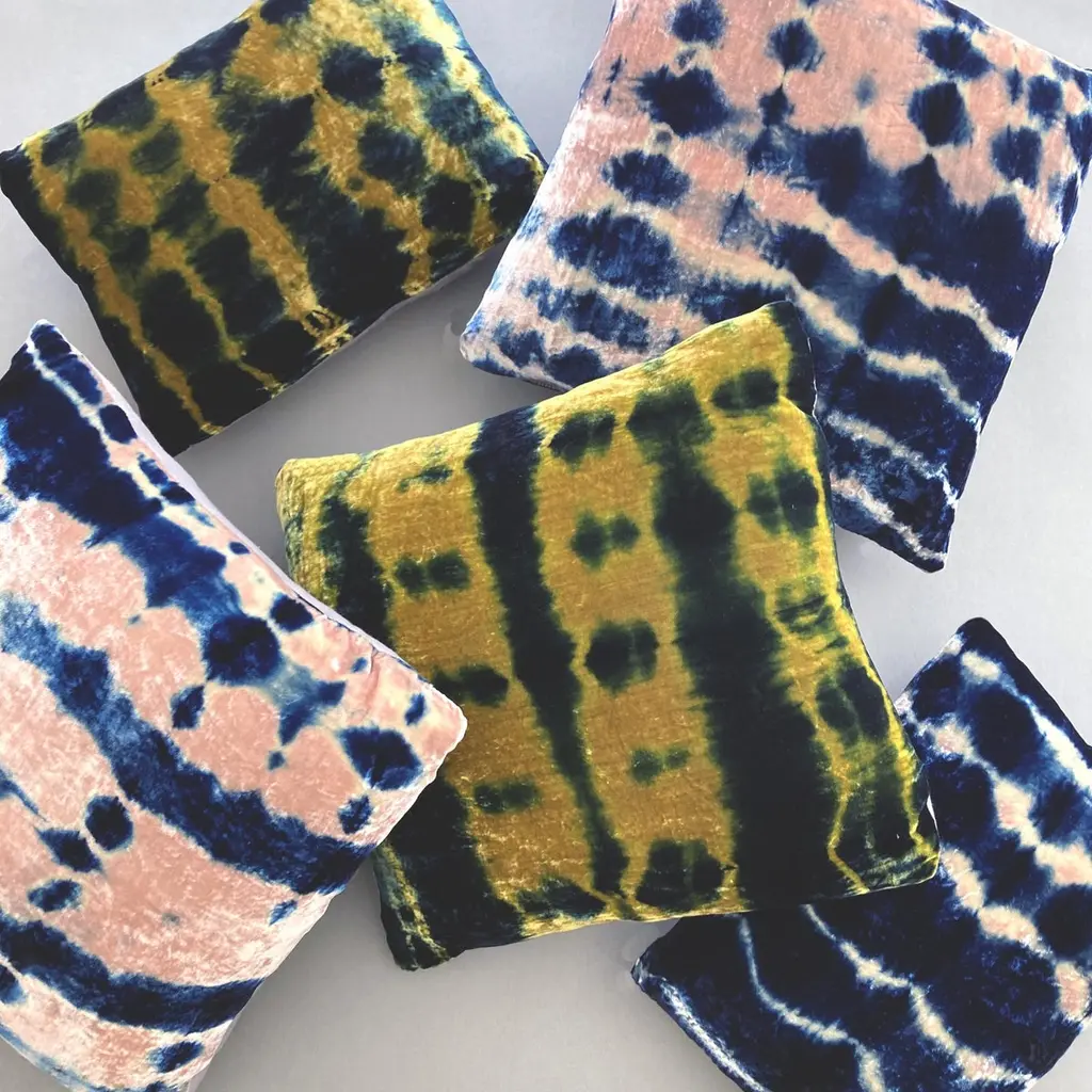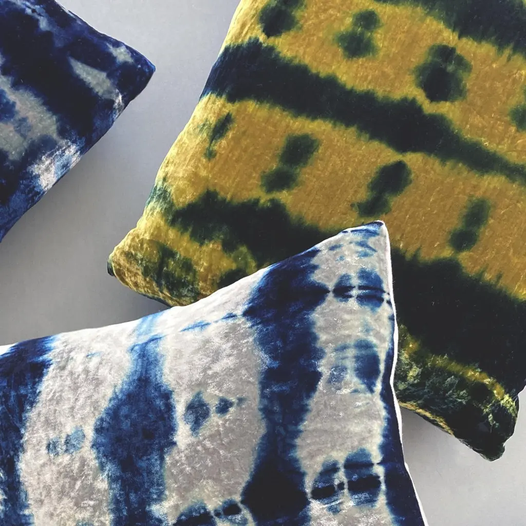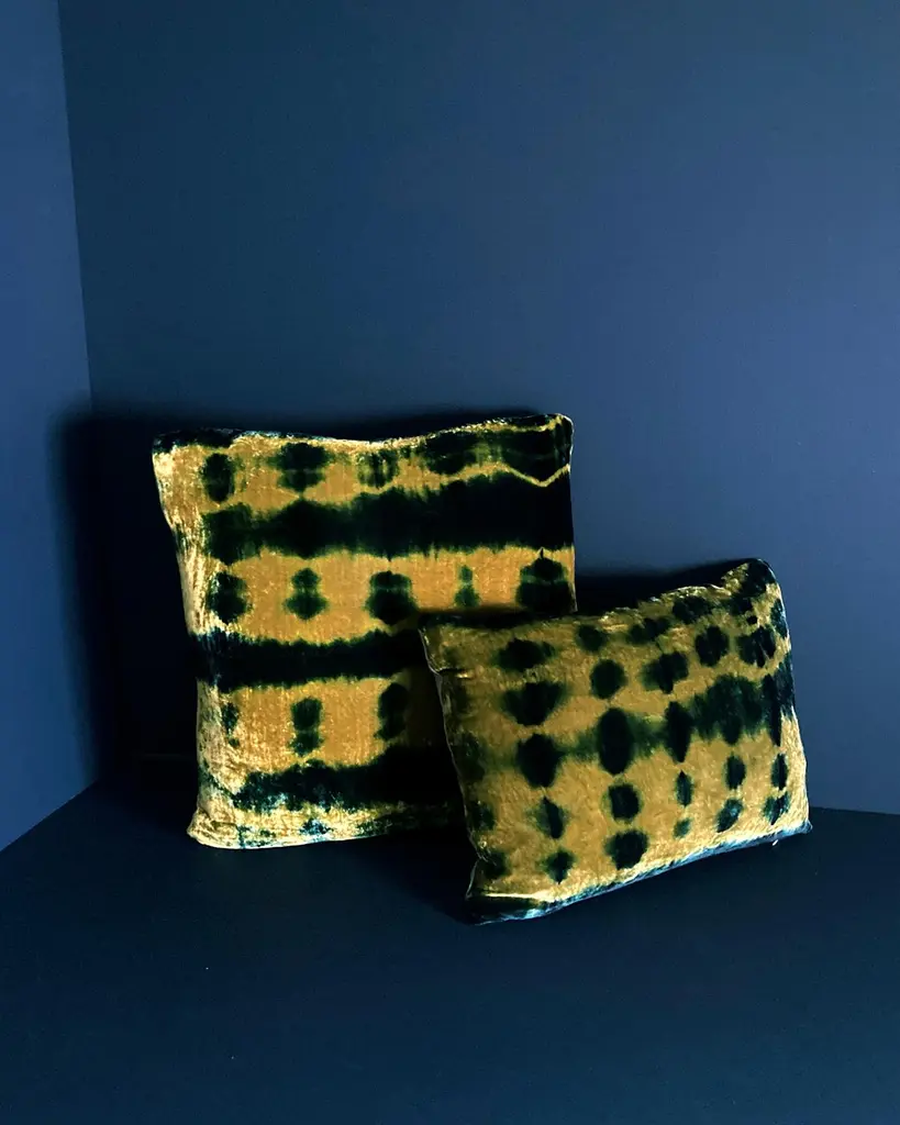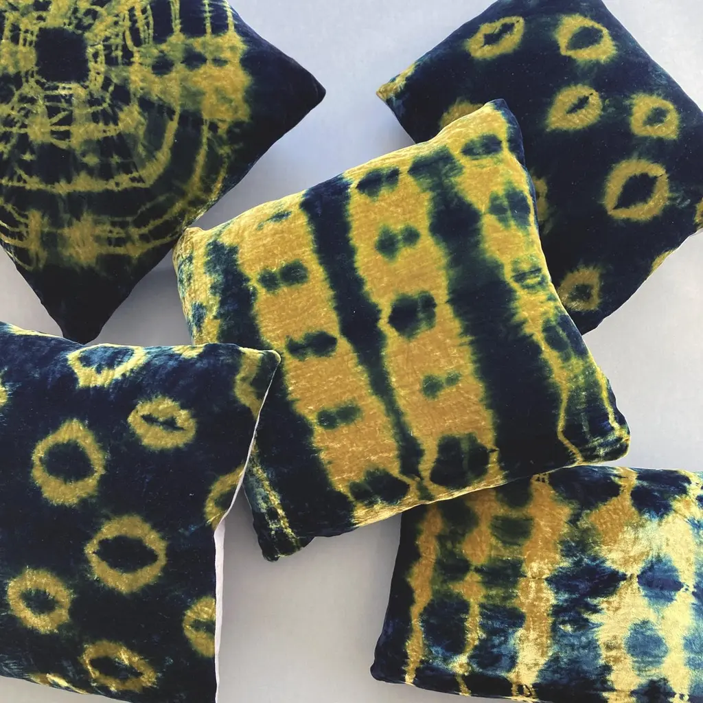 Gold velvet pillow dyed with indigo in Pleat pattern with gray linen backing. Sustainably hand-dyed and sewn in New York City, down pillow insert made locally in NYC. Pillow measures 18 x 18 inches. Each velvet pillow is hand made and one of a kind.Custom colors and sizes available. Please message to inquire about custom orders.Each silk velvet pillow is cut and folded by hand, in the shibori style, before it is dyed through a series of indigo dips. To achieve a rich blue color, each is dipped and oxidized several times, before setting, hand-washing and drying. Note: Invisible zip closure at bottom of pillow. Slight variations may occur within the design. Care Instructions: Spot treat only. Do not dry clean or machine wash.