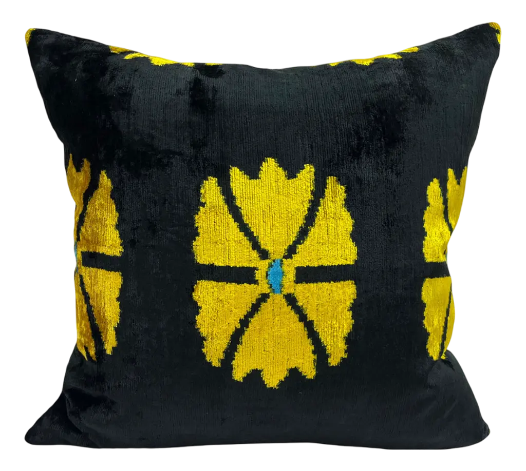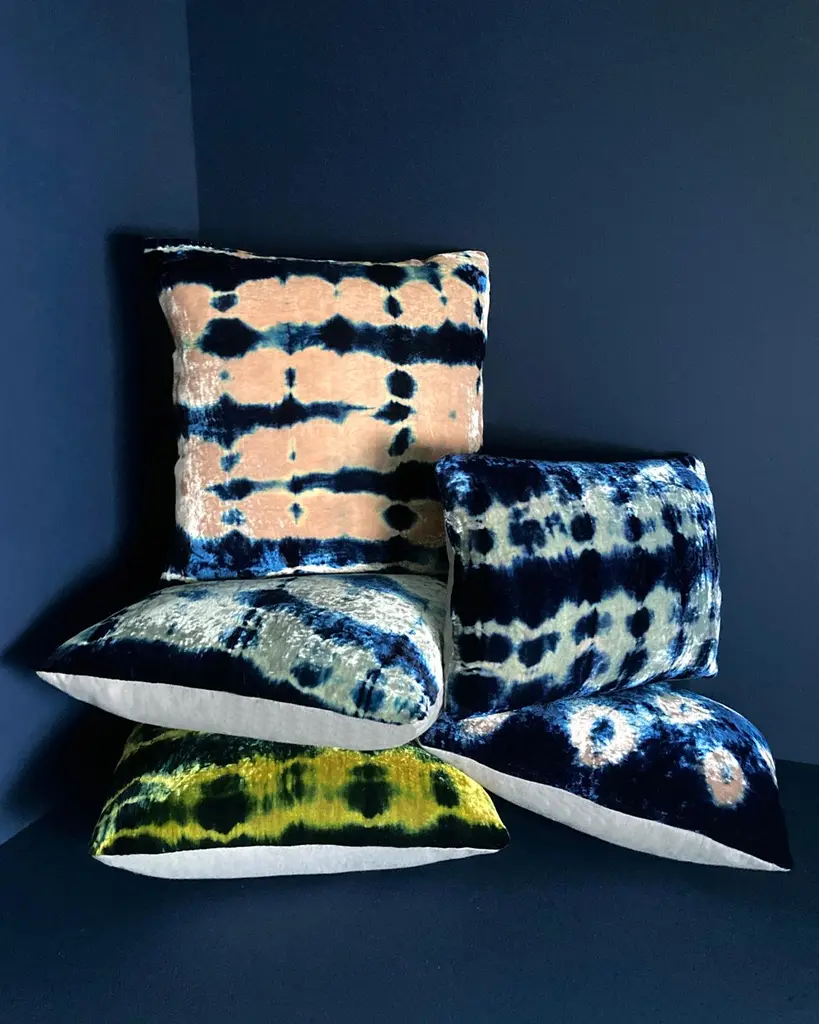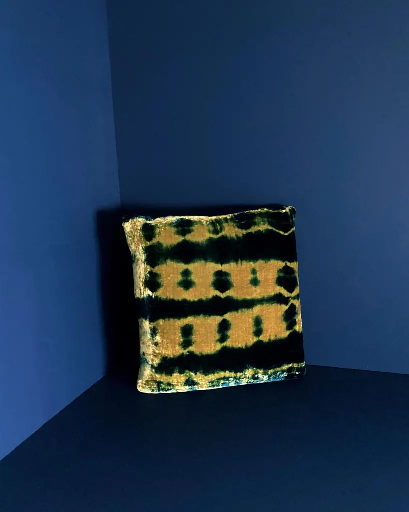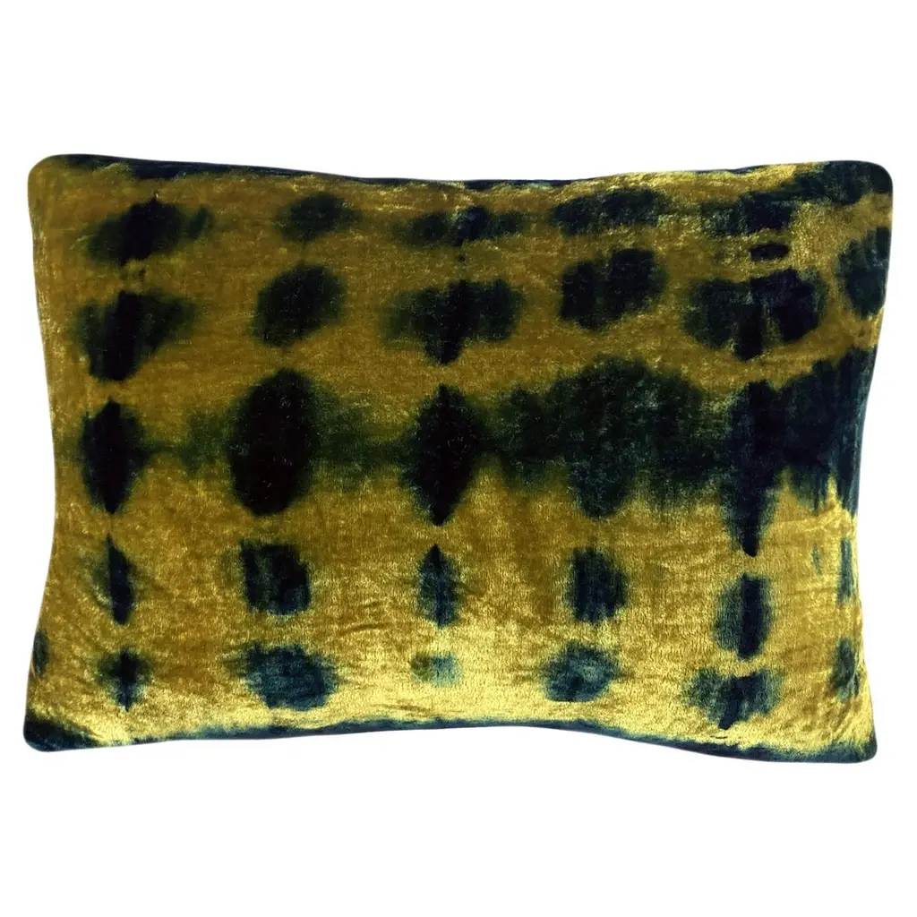 Gold velvet pillow dyed with indigo in Pleat pattern with gray linen backing. Sustainably hand-dyed and sewn in New York City, down pillow insert made locally in NYC. Pillow measures 18 x 18 inches. Each velvet pillow is hand made and one of a kind.Custom colors and sizes available. Please message to inquire about custom orders.Each silk velvet pillow is cut and folded by hand, in the shibori style, before it is dyed through a series of indigo dips. To achieve a rich blue color, each is dipped and oxidized several times, before setting, hand-washing and drying. Note: Invisible zip closure at bottom of pillow. Slight variations may occur within the design. Care Instructions: Spot treat only. Do not dry clean or machine wash.