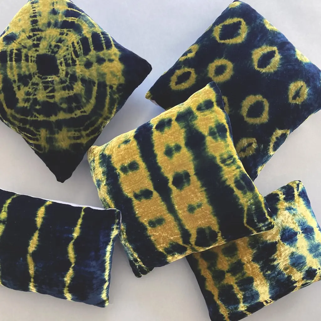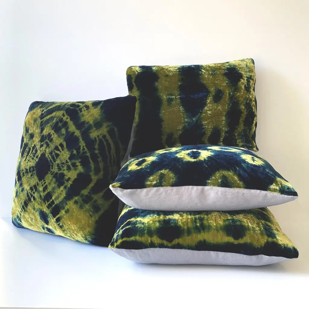 Gold velvet pillow dyed with indigo in Halo pattern with gray linen backing. Sustainably hand-dyed and sewn in New York City, down pillow insert made locally in NYC. Pillow measures 18 x 18 inches. Each velvet pillow is hand made and one of a kind.Custom colors and sizes available. Please message to inquire about custom orders.Each silk velvet pillow is cut and folded by hand, in the shibori style, before it is dyed through a series of indigo dips. To achieve a rich blue color, each is dipped and oxidized several times, before setting, hand-washing and drying. Note: Invisible zip closure at bottom of pillow. Slight variations may occur within the design. Care Instructions: Spot treat only. Do not dry clean or machine wash.