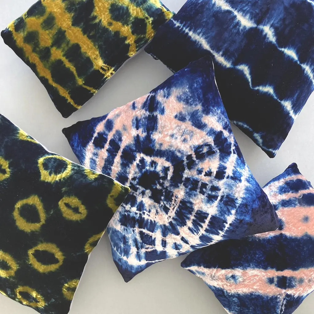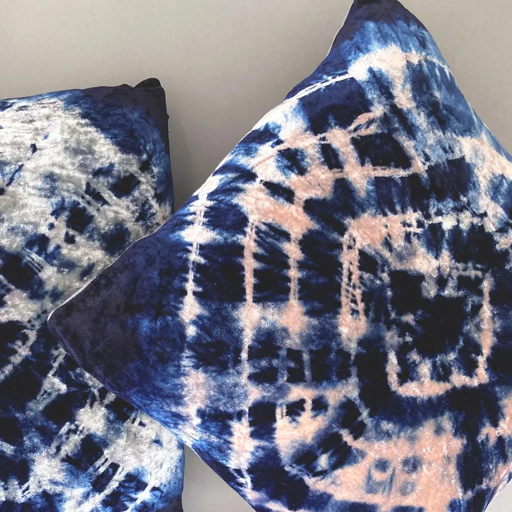 Rose velvet pillow dyed with indigo in Halo pattern with gray linen backing. Sustainably hand-dyed and sewn in New York City, down pillow insert made locally in NYC. Pillow measures 18 x 18 inches. Each velvet pillow is hand made and one of a kind.Custom colors and sizes available.Each silk velvet pillow is cut and folded by hand, in the shibori style, before it is dyed through a series of indigo dips. To achieve a rich blue color, each is dipped and oxidized several times, before setting, hand-washing and drying. Note: Invisible zip closure at bottom of pillow. Slight variations may occur within the design. Care Instructions: Spot treat only. Do not dry clean or machine wash.