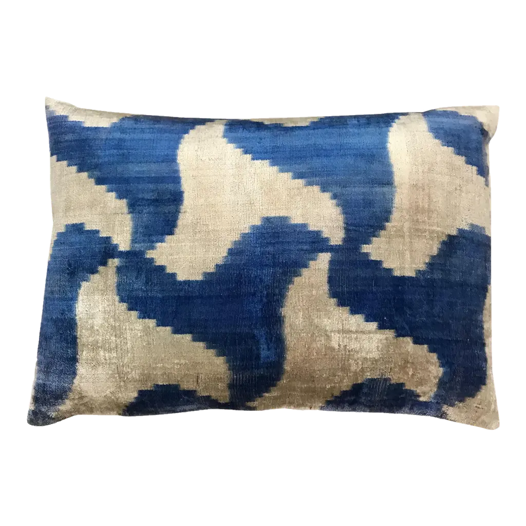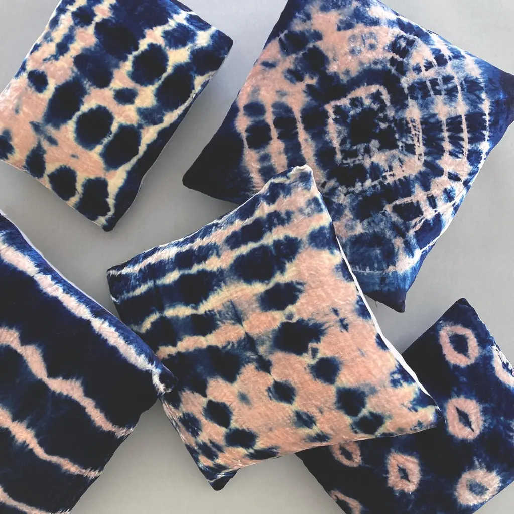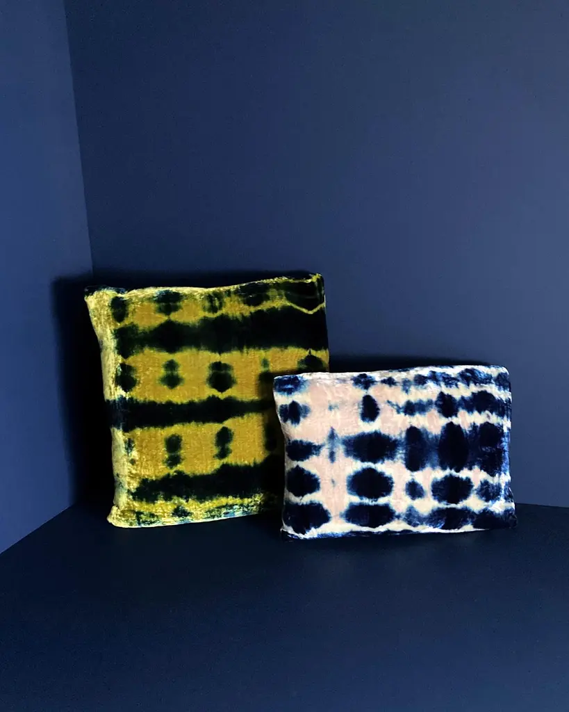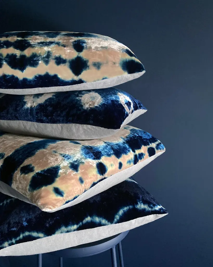 Rose velvet pillow dyed with indigo in Inkblot pattern with gray linen backing. Sustainably hand-dyed and sewn in New York City, down pillow insert made locally in NYC. Pillow measures 12 x 16 inches. Each velvet pillow is hand made and one of a kind.Custom colors and sizes available. Please message to inquire about custom orders.Each silk velvet pillow is cut and folded by hand, in the shibori style, before it is dyed through a series of indigo dips. To achieve a rich blue color, each is dipped and oxidized several times, before setting, hand-washing and drying. Note: Invisible zip closure at bottom of pillow. Slight variations may occur within the design. Care Instructions: Spot treat only. Do not dry clean or machine wash.