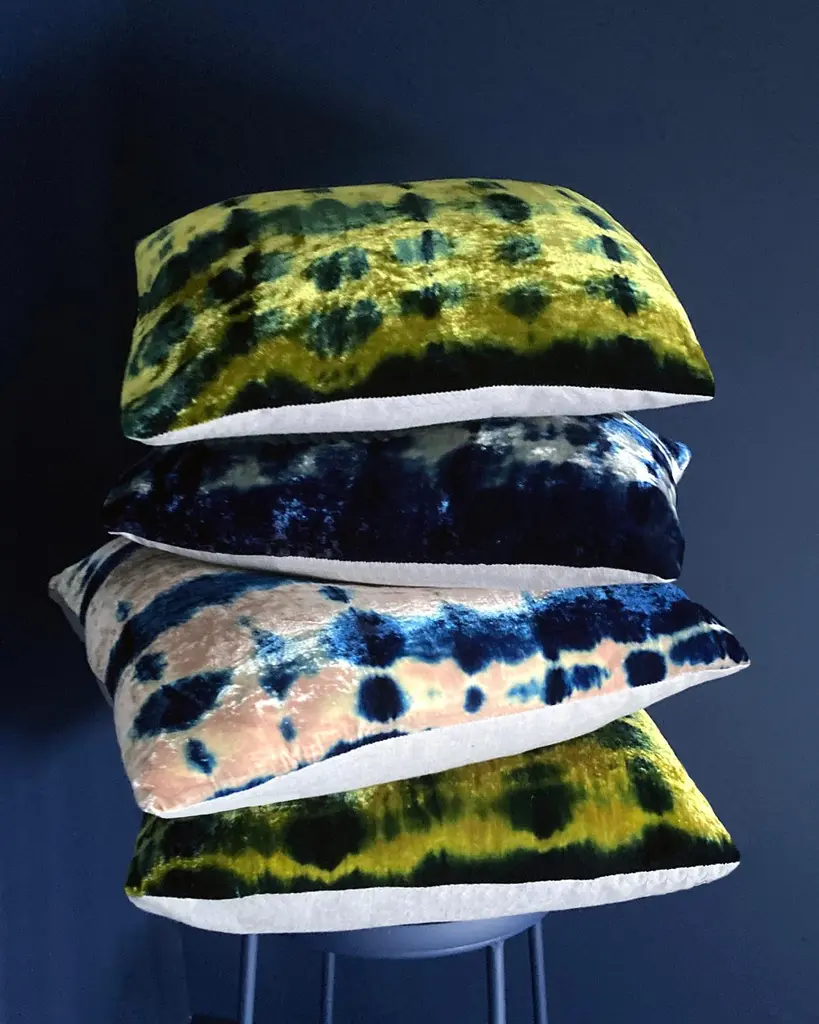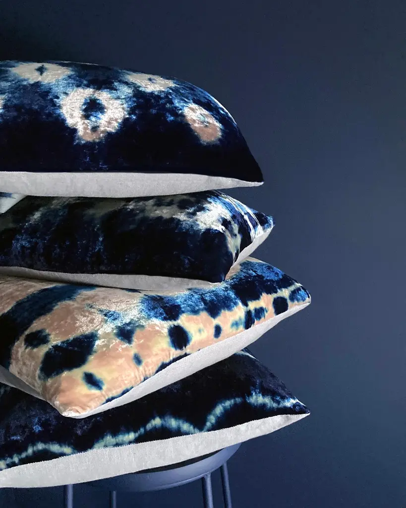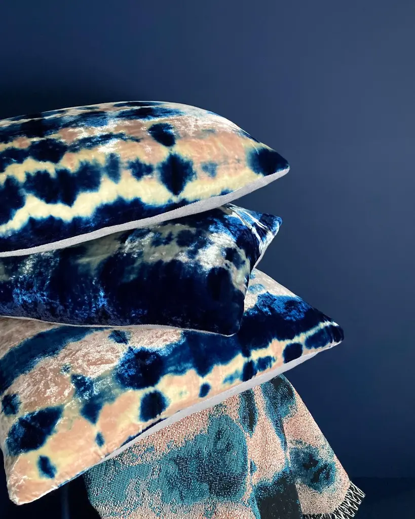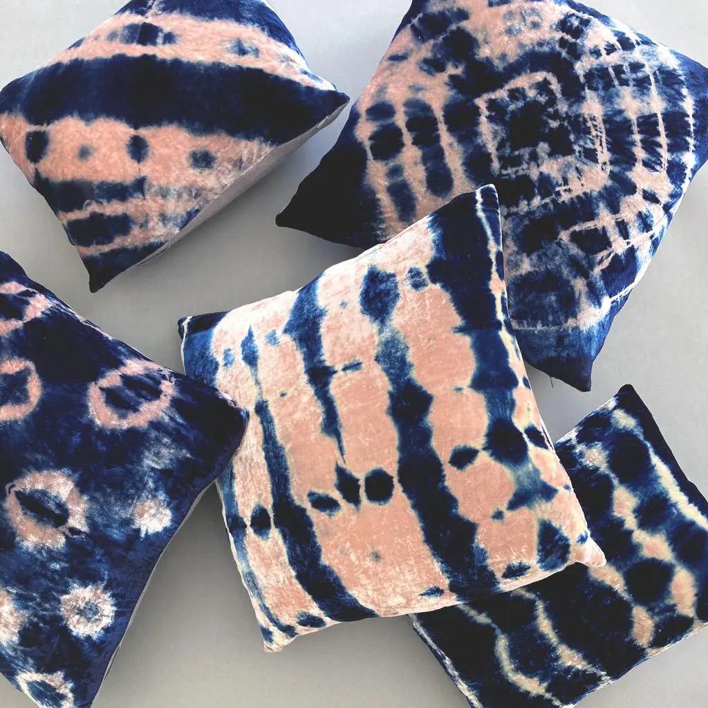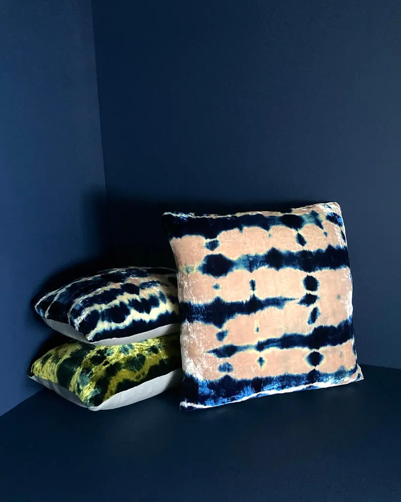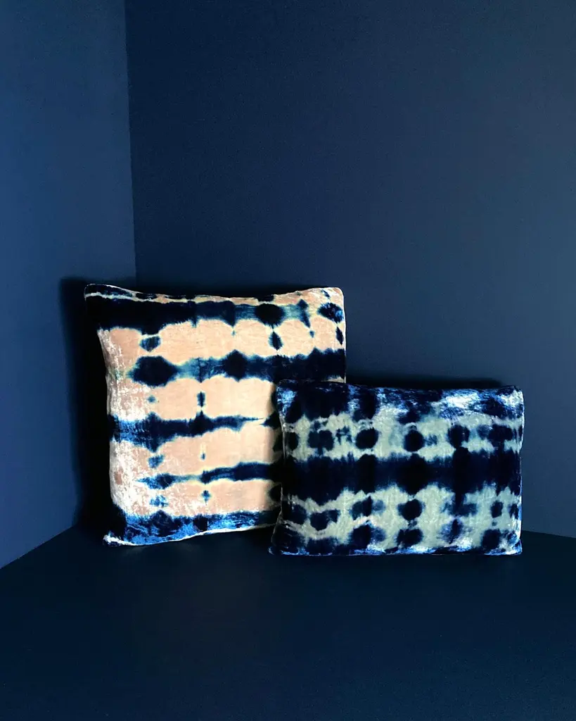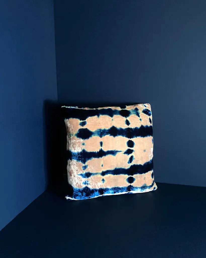 Rose velvet pillow dyed with indigo in Pleat pattern with gray linen backing. Sustainably hand-dyed and sewn in New York City, down pillow insert made locally in NYC. Pillow measures 18 x 18 inches. Each velvet pillow is hand made and one of a kind.Custom colors and sizes available. Please message to inquire about custom orders.Each silk velvet pillow is cut and folded by hand, in the shibori style, before it is dyed through a series of indigo dips. To achieve a rich blue color, each is dipped and oxidized several times, before setting, hand-washing and drying. Note: Invisible zip closure at bottom of pillow. Slight variations may occur within the design. Care Instructions: Spot treat only. Do not dry clean or machine wash.