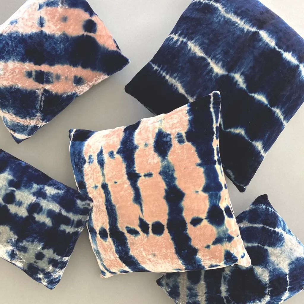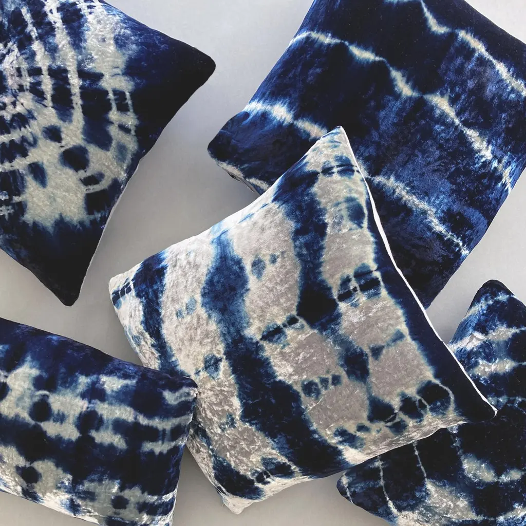 Silver velvet pillow dyed with indigo in Halo pattern with gray linen backing. Sustainably hand-dyed and sewn in New York City, down pillow insert made locally in NYC. Pillow measures 12 x 16 inches. Each velvet pillow is hand made and one of a kind.Custom colors and sizes available. Please message to inquire about custom orders.Each silk velvet pillow is cut and folded by hand, in the shibori style, before it is dyed through a series of indigo dips. To achieve a rich blue color, each is dipped and oxidized several times, before setting, hand-washing and drying. Note: Invisible zip closure at bottom of pillow. Slight variations may occur within the design. Care Instructions: Spot treat only. Do not dry clean or machine wash.