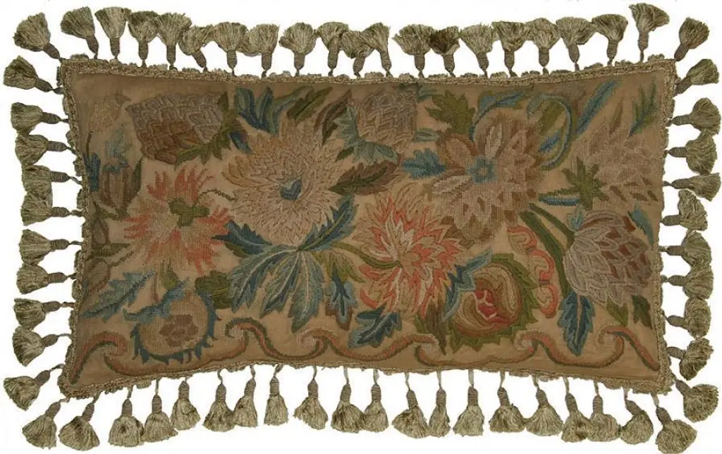 Overall measurements (inches) 16H x 24W x 4D. This refined new hand-embroidered throw pillow features an elegant design of flowers in muted tones of brown/beige. The artful throw pillow is accented by a soft green and bronze tassel trim. Backed in beige canvas, the reverse features a zip to access the down and feather insert. The hand-embroidered throw pillow will work beautifully in either a traditional or contemporary style decor. Overall Condition is New. Material(s): Canvas. Style: Traditional. Dates to circa New.