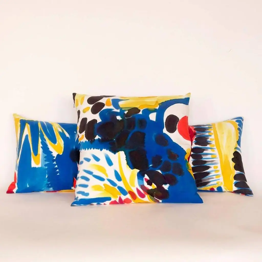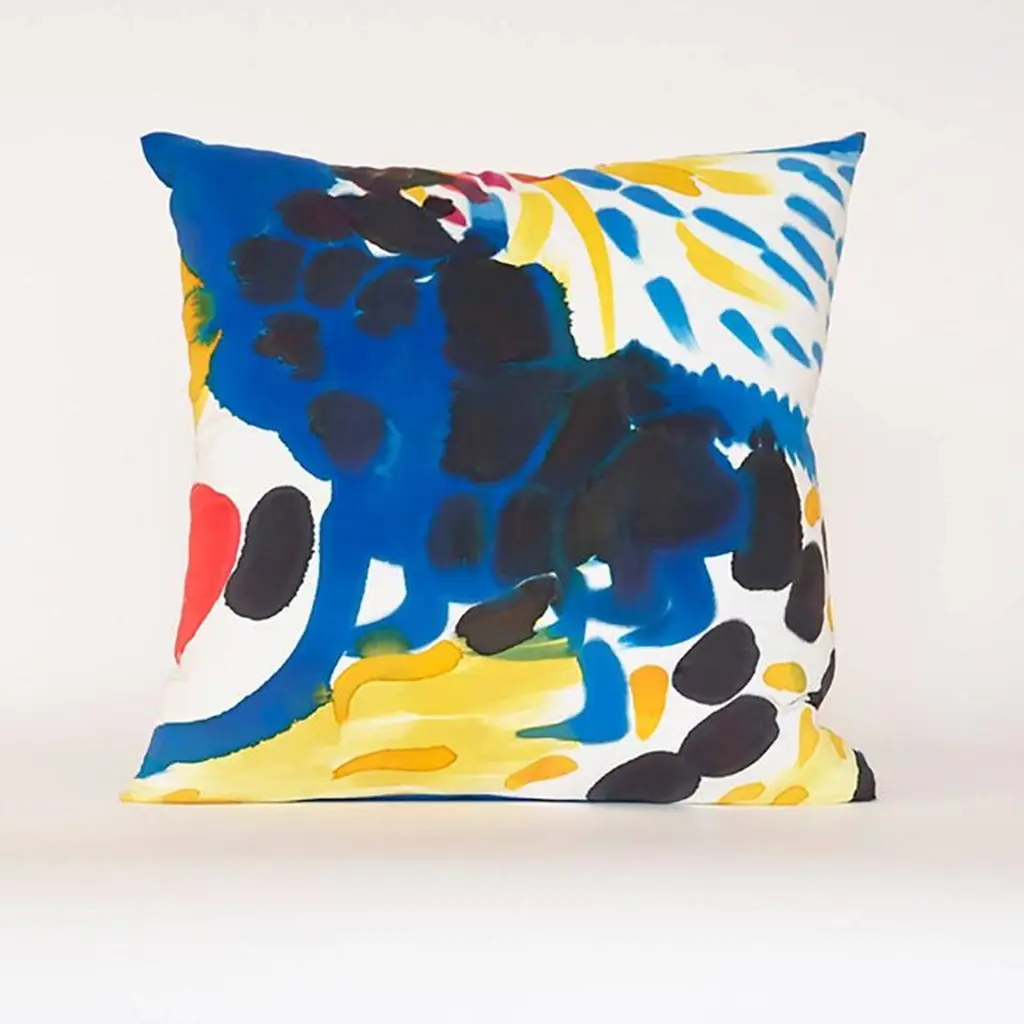For Fort Makers, Naomi Clark paints vibrant abstract compositions on fabrics that are then made into useable objects. The Parrot painting style is loosely a pattern in the way that it maintains form and color, yet it also changes consistently. No piece is exactly like another.Materials: silk charmeuse, fabric paint, removable polyester pillow insert, zipperCare instructions: dry clean onlyLead Time: Made to order, 6-7 weeksCustomized orders are non-refundable