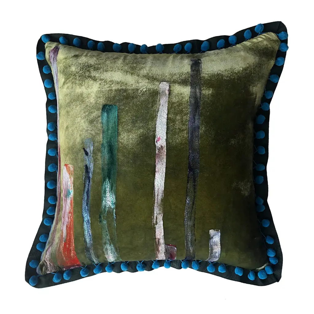 This polyester-padded cushion owes its preciousness to its exclusively artisan crafting process. The removable azure-toned cover - obtained by blending 67% cotton, 22% viscose, and 11% linen yarns - flaunts an explosion of polychrome speckles also veiling the bright white brushstroke on the side. Please contact the Concierge for available variants.