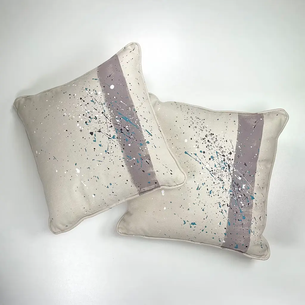 An outstanding artistic flair distinguishes this square artisan cushion, its removable cover recreating a canvas where a deep-gray brushstroke interacts with a triumph of polychrome speckles. Woven blending 67% cotton, 22% viscose and 11% linen yarns, the soft cover envelops a truly generous polyester padding for impeccable comfort. Dry-washing safe, the cushion is also available in a variety of color and size options.
