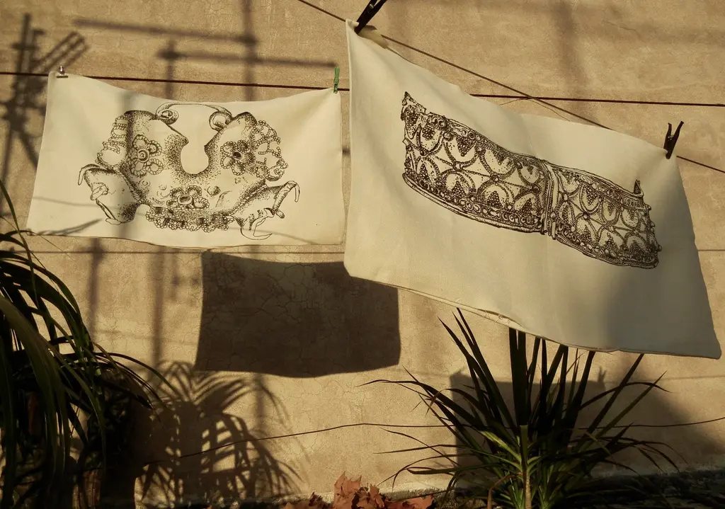 The Jewels Collection by the House of Ita was shown at the EDIT NAPOLI Design Fair 2019. It is unique and hand-painted on natural materials such as silk linen, hemp, and cotton. These materials create precious pillows, runners, table cloths, bed coverings, curtains, wall panels, and soft furnishings. The designs are inspired by Macedonian medieval heritage: 14th-century jewelry and ornaments like earrings, bracelets, necklaces, belt buckles, and head ornaments made of gold, silver, semi-precious stones, and coloured glass. Labeled by Maker,Labeled by Maker