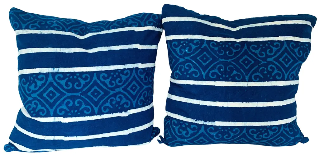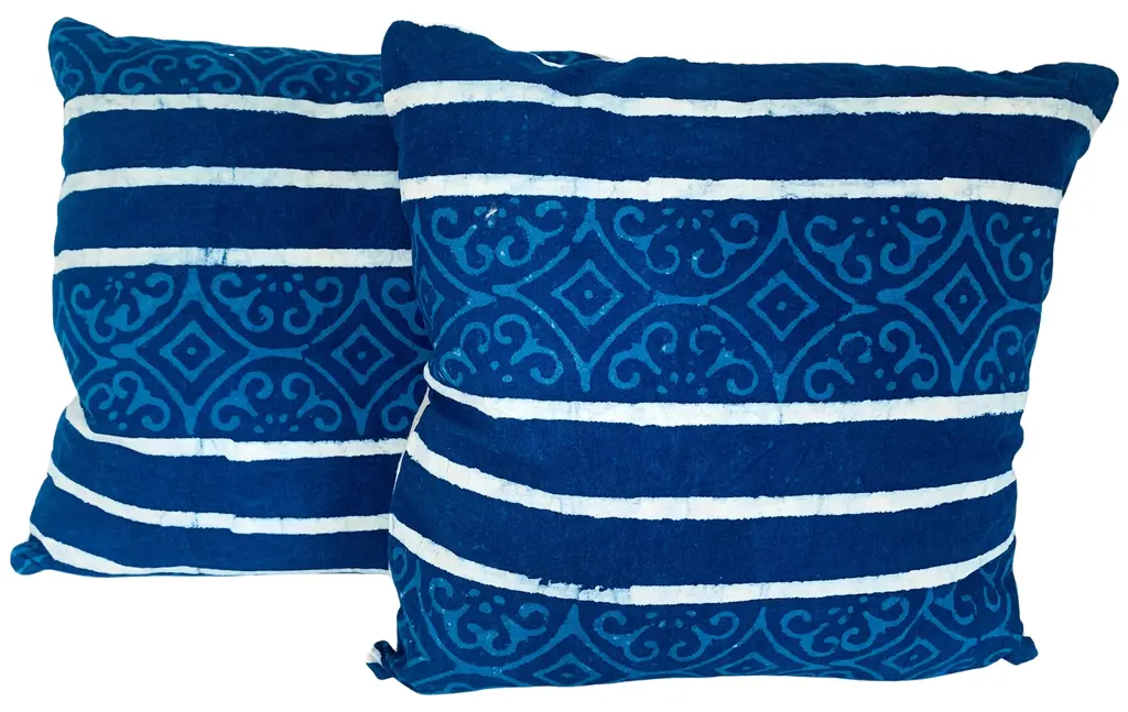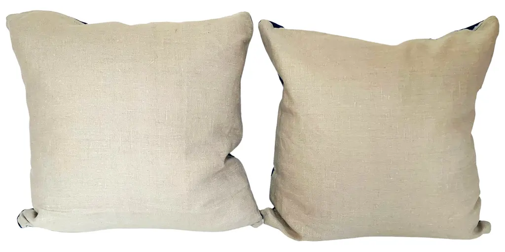 Pair of hand-printed Indian shibori custom-made throw pillows. New neutral beige cotton fabric back, zipper closure, and new generous duck feather-and-down fill insert.