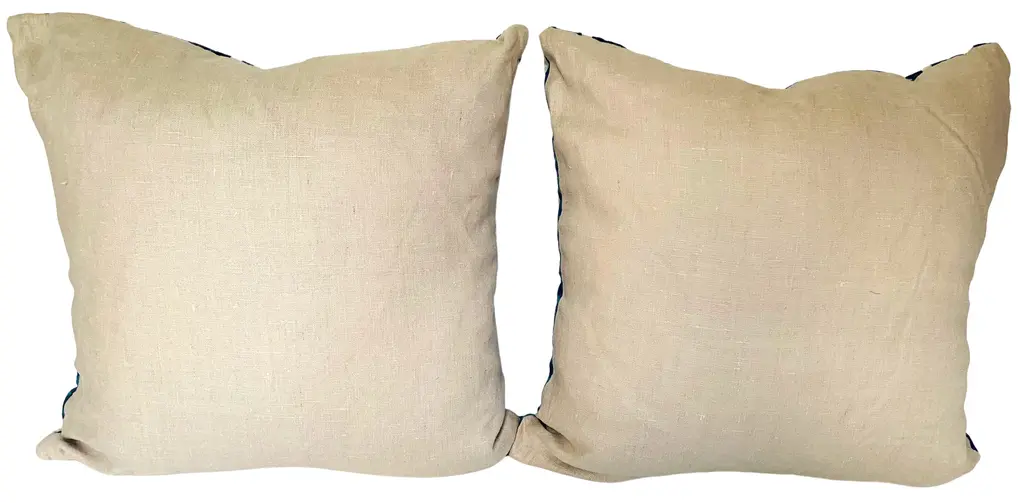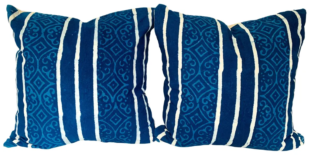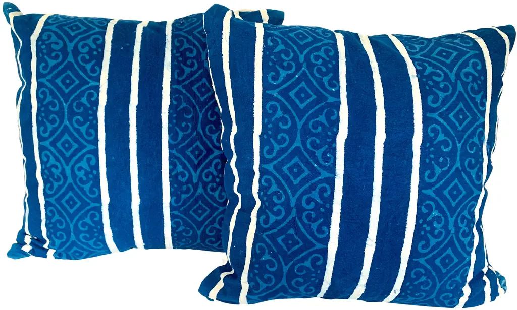 Pair of hand-printed Indian shibori custom-made throw pillows. New neutral beige cotton fabric back, zipper closure, and new generous duck feather-and-down fill insert.