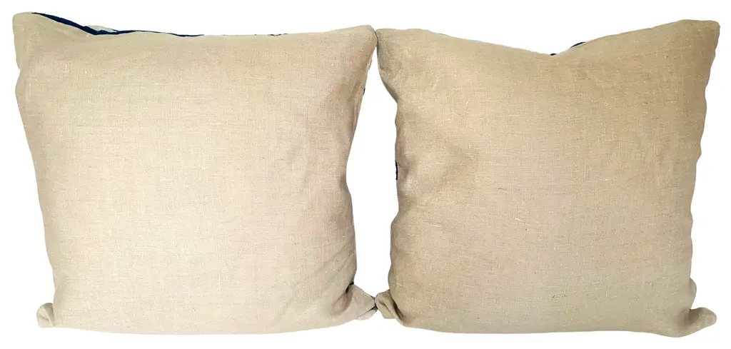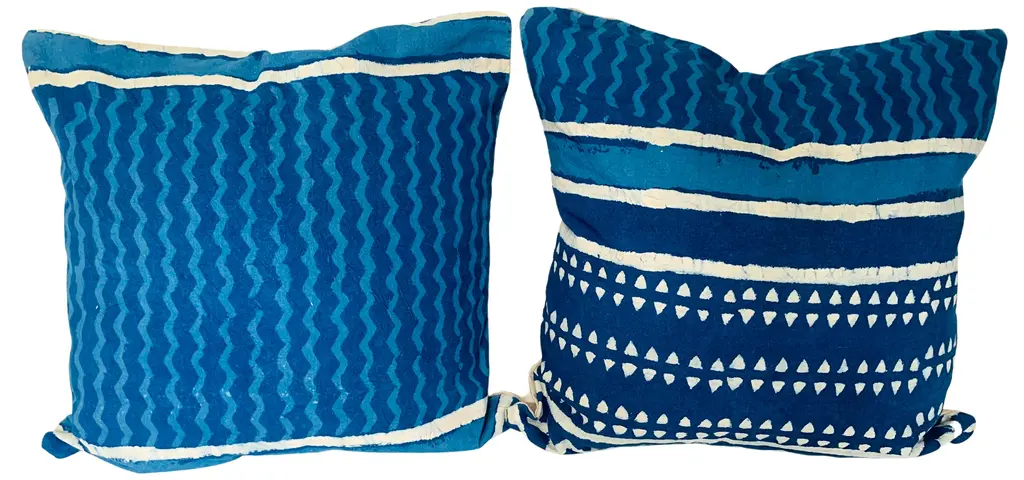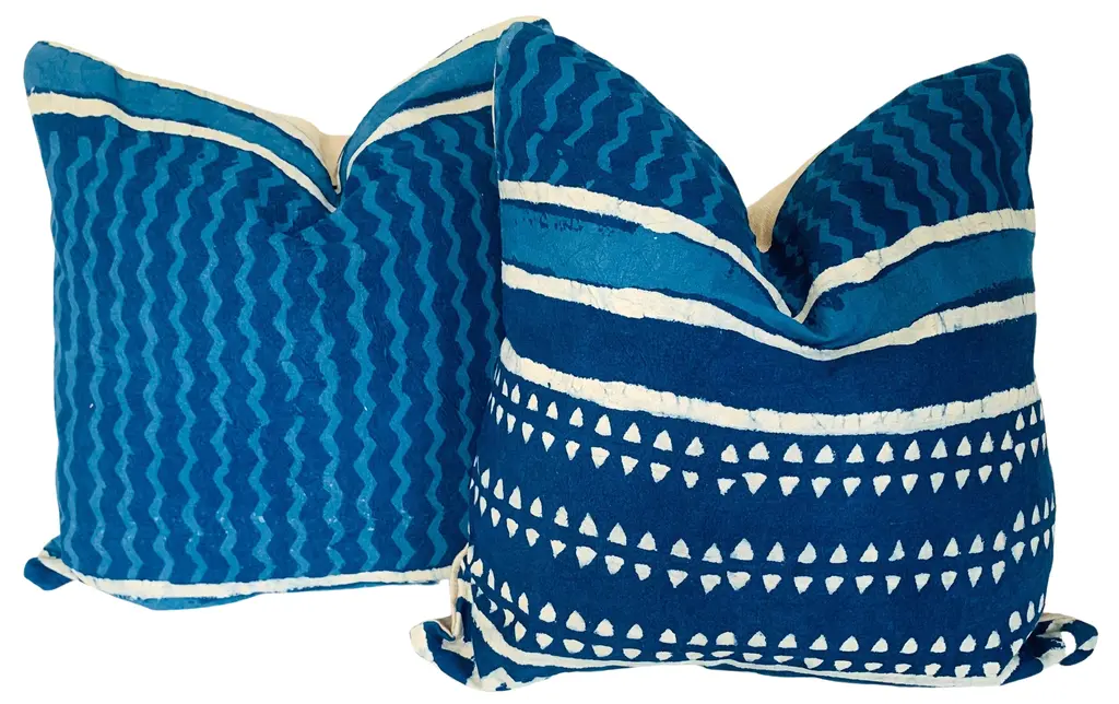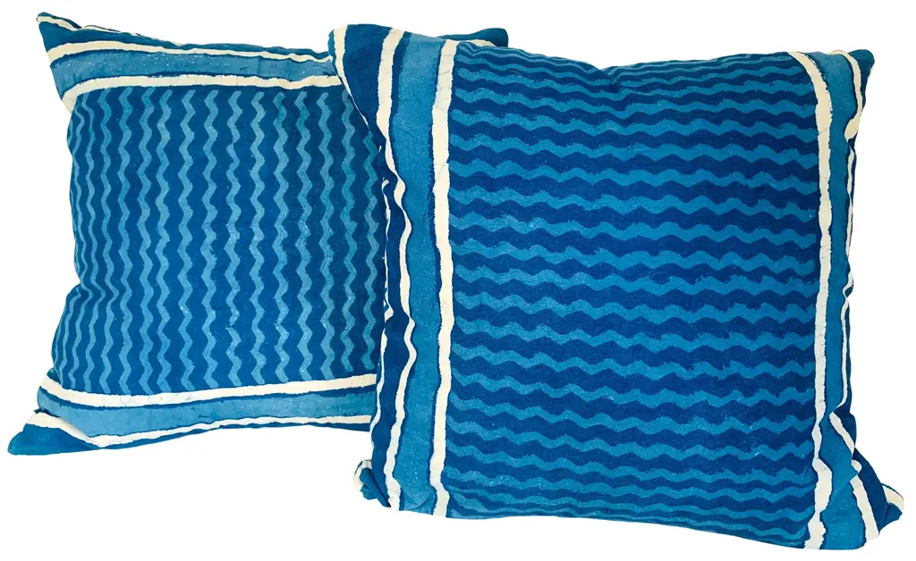 Pair of hand-printed Indian Shibori custom-made throw pillows. New neutral beige cotton fabric back, zipper closure, and new generous duck feather-and-down fill insert.