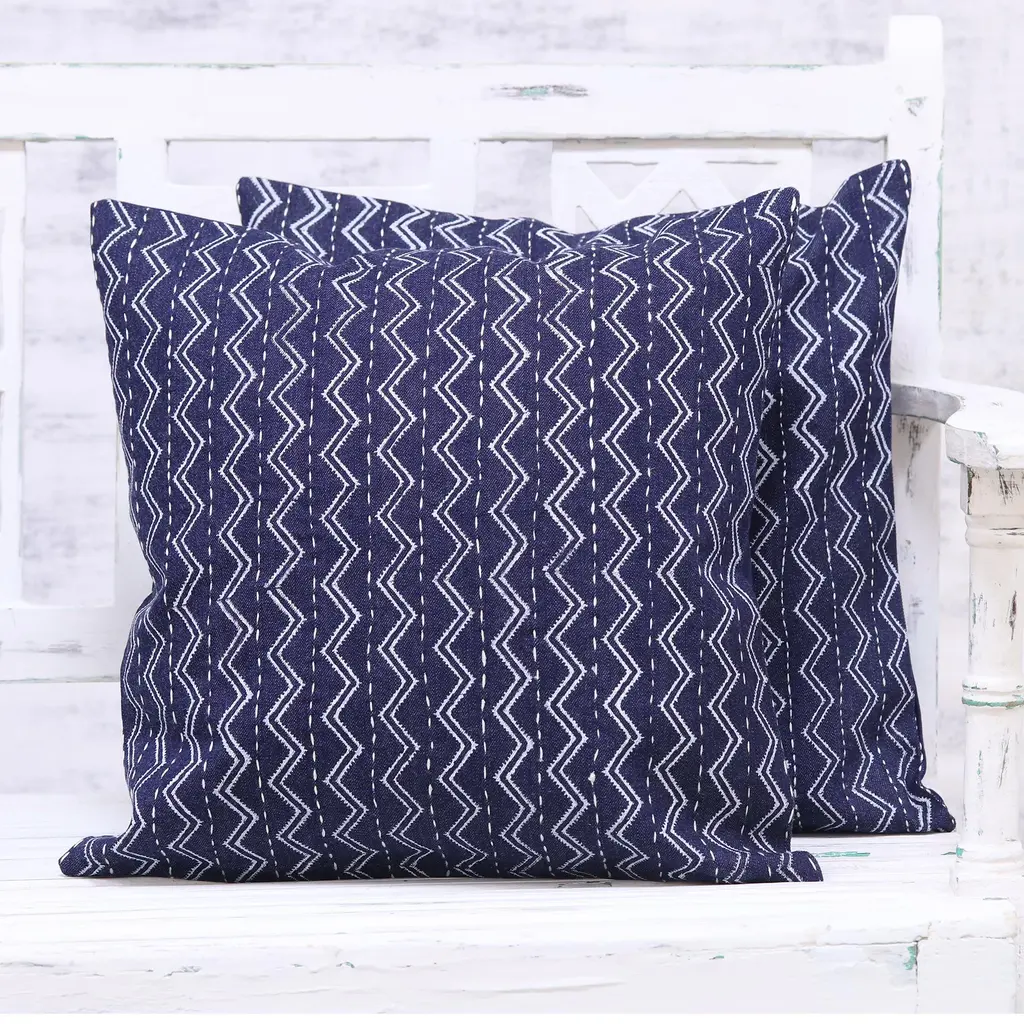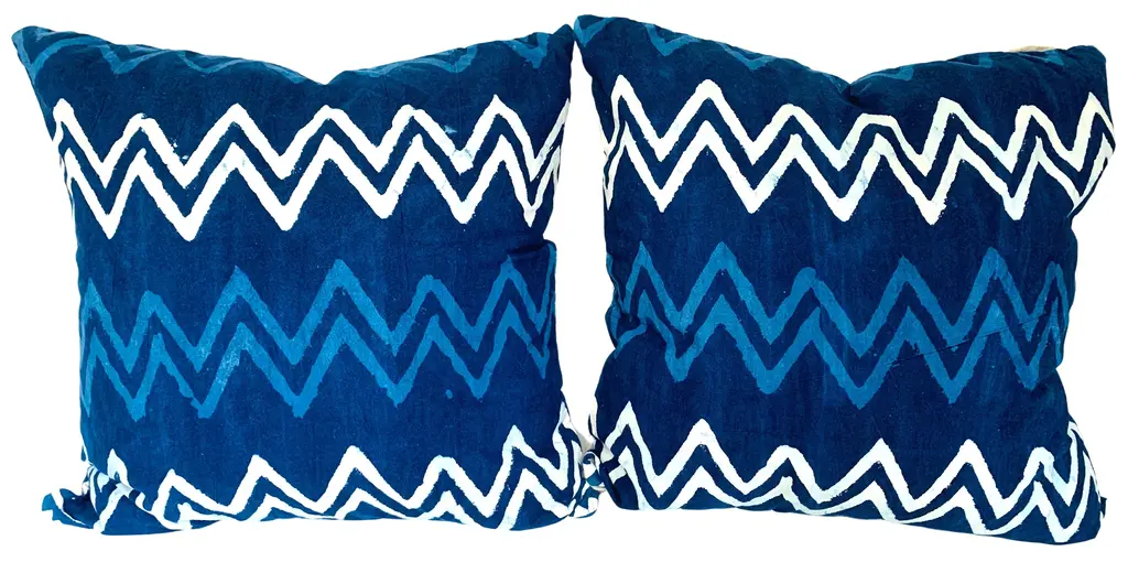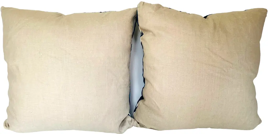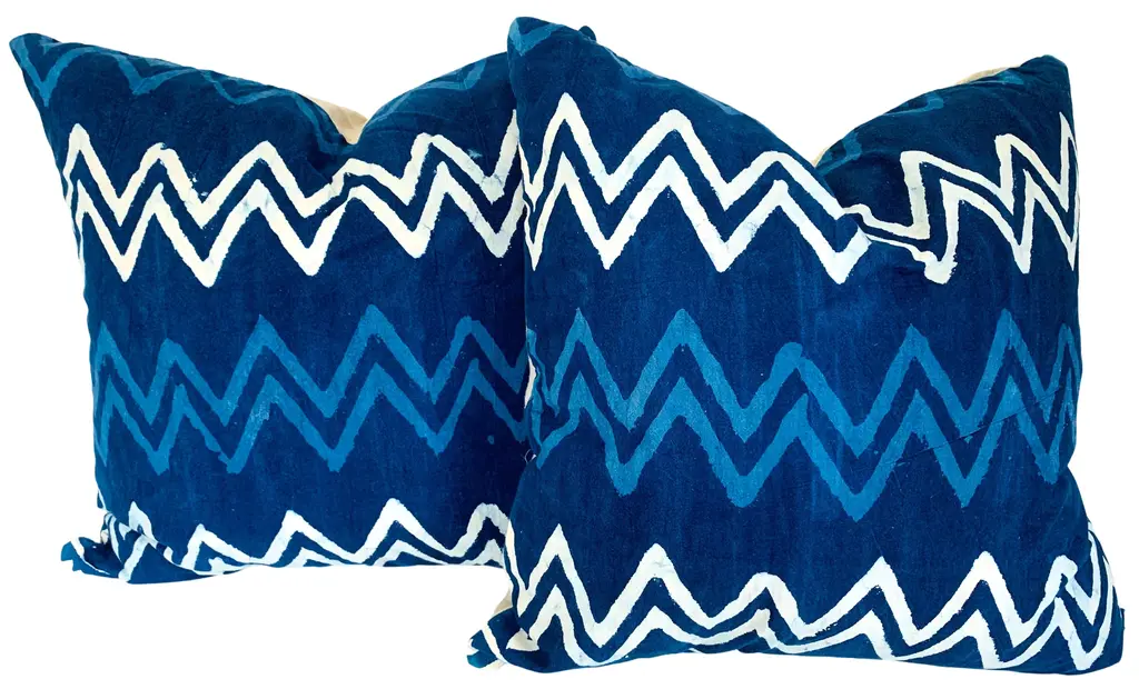 Pair of hand-printed Indian shibori custom-made throw pillows. New neutral beige cotton fabric back, zipper closure, and new generous duck feather-and-down fill insert.