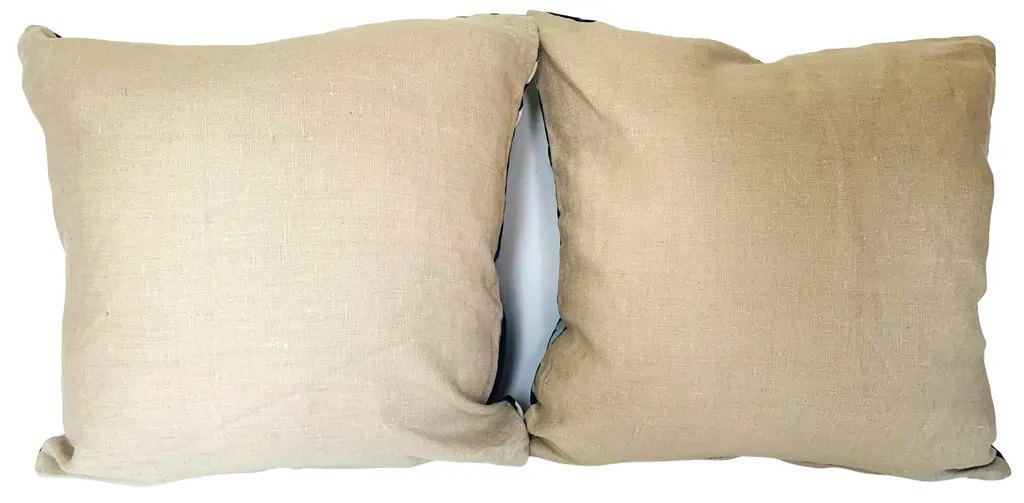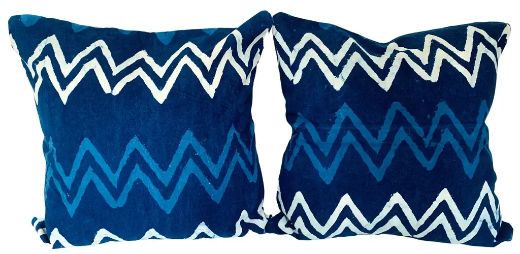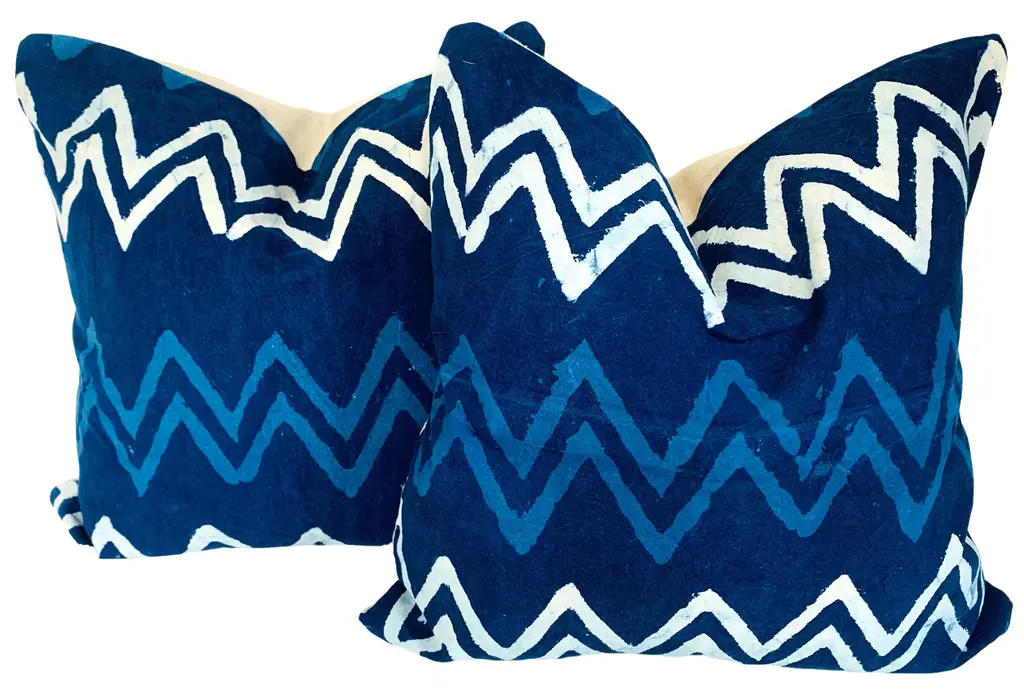 Pair of hand-printed Indian shibori custom-made throw pillows. New neutral beige cotton fabric back, zipper closure, and new generous duck feather-and-down fill insert.
