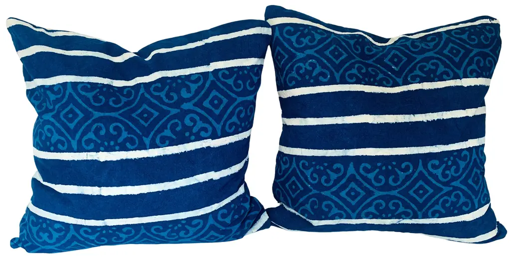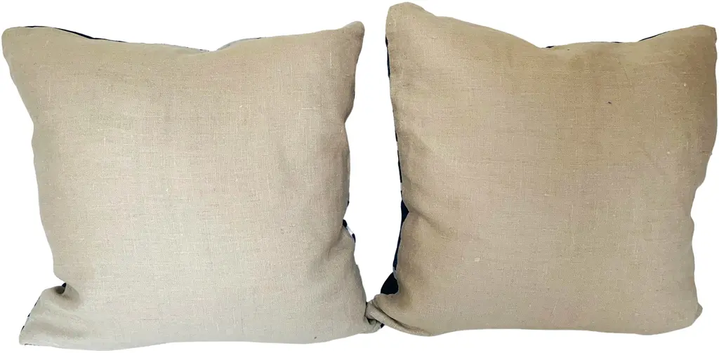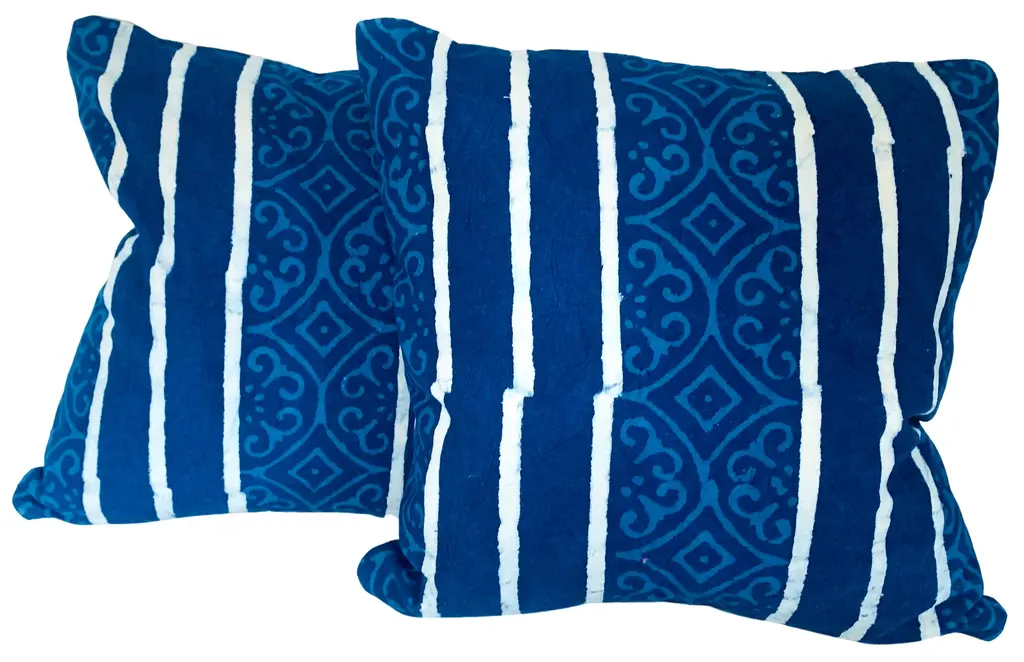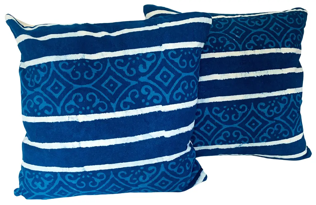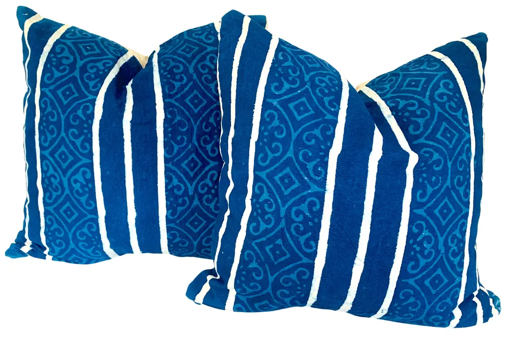Pair of hand-printed Indian shibori custom-made throw pillows. New neutral beige cotton fabric back, zipper closure, and new generous duck feather-and-down fill insert.