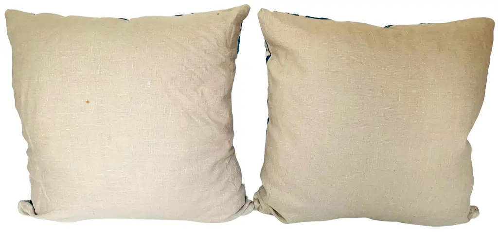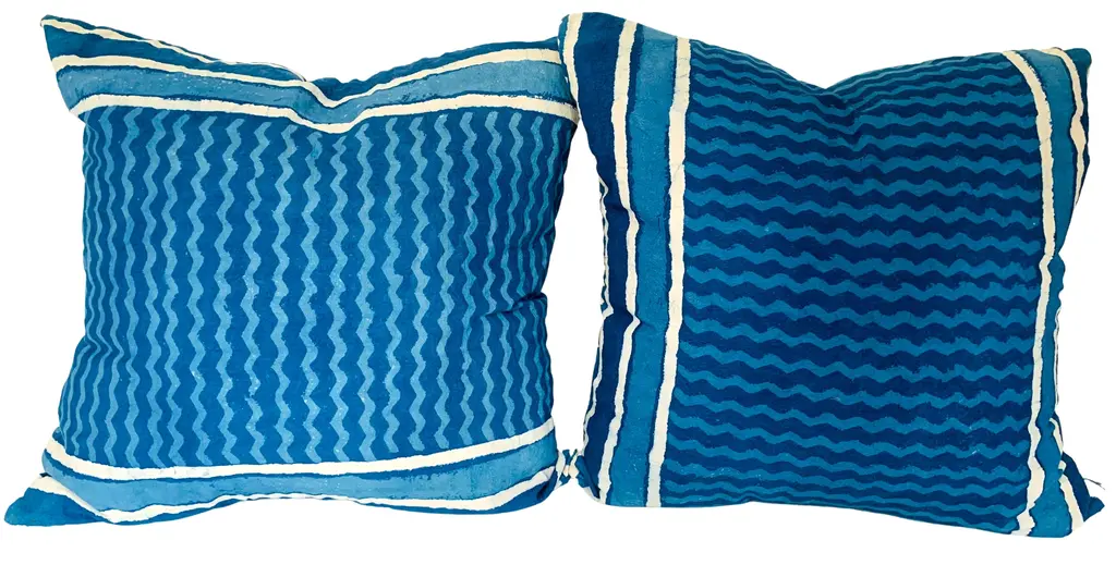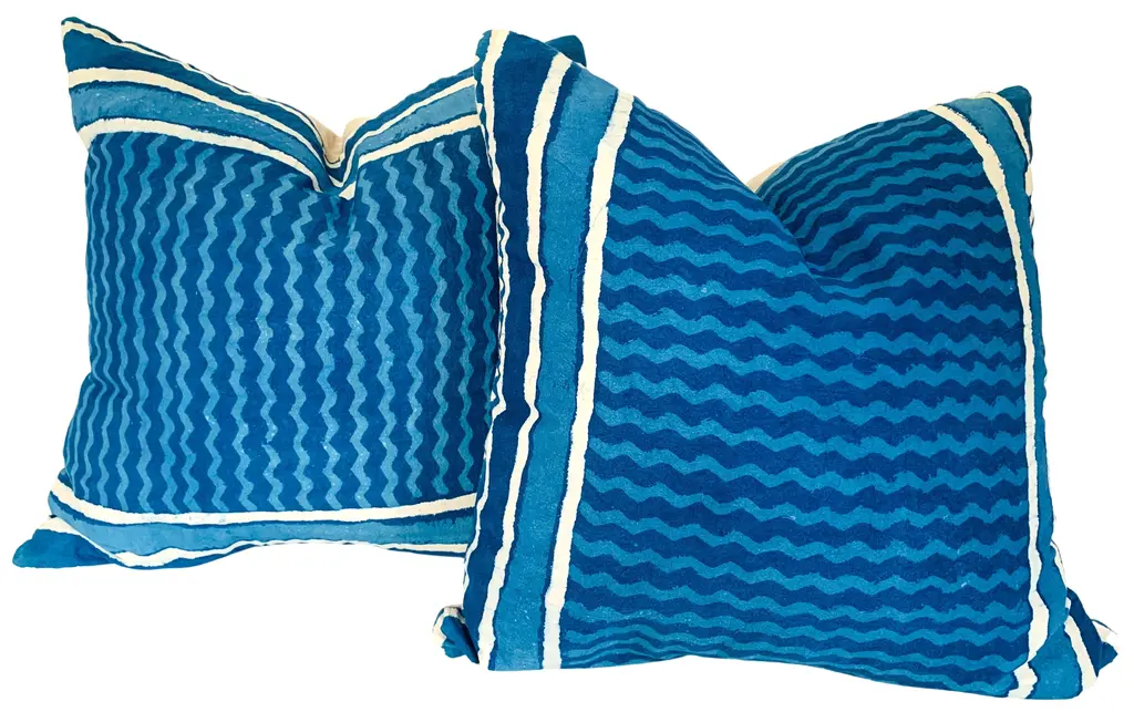 Pair of hand-printed Indian shibori custom-made throw pillows. New neutral beige cotton fabric back, zipper closure, and new generous duck feather-and-down fill insert.