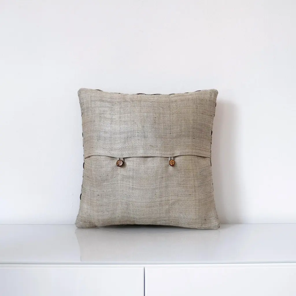 Handcrafted cushion cover made with naturally dyed and delicately woven T’nalak cloth from Abaca fibres and fastened with coconut shell buttonsColour: light sand and oatmealMeasures: 45 x 45 cm17.7? x 17.7?Recommended cushion filler: 56 x 56 cm / 22? x 22?.Cushion covers are shipped without fillers.Handmade in the PhilippinesProduction lead time: 12 weekThis handcrafted cushion cover is made from T’nalak cloth. T’nalak is a specialty fabric made from 100% Abaca fibres of the banana family, woven and considered sacred by the women of the T’boli tribe from Lake Sebu of South Cotabato, Mindanao, Philippines.