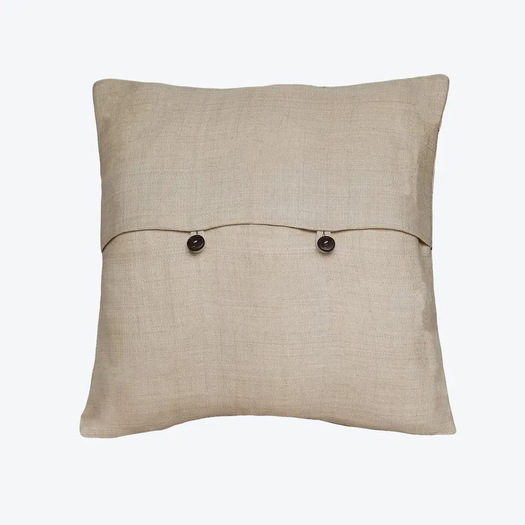 Handcrafted cushion cover made with naturally dyed and delicately woven T’nalak cloth from Abaca fibres and fastened with coconut shell buttonsColour: light sand and oatmealMeasures: 45 x 45 cm17.7in x 17.7inRecommended cushion filler: 56 x 56 cm / 22in x 22inCushion covers are shipped without fillers.Handmade in the PhilippinesProduction lead time: 10 weeksThis handcrafted cushion cover is made from T’nalak cloth. T’nalak is a specialty fabric made from 100% Abaca fibres of the banana family, woven and considered sacred by the women of the T’boli tribe from Lake Sebu of South Cotabato, Mindanao, Philippines.